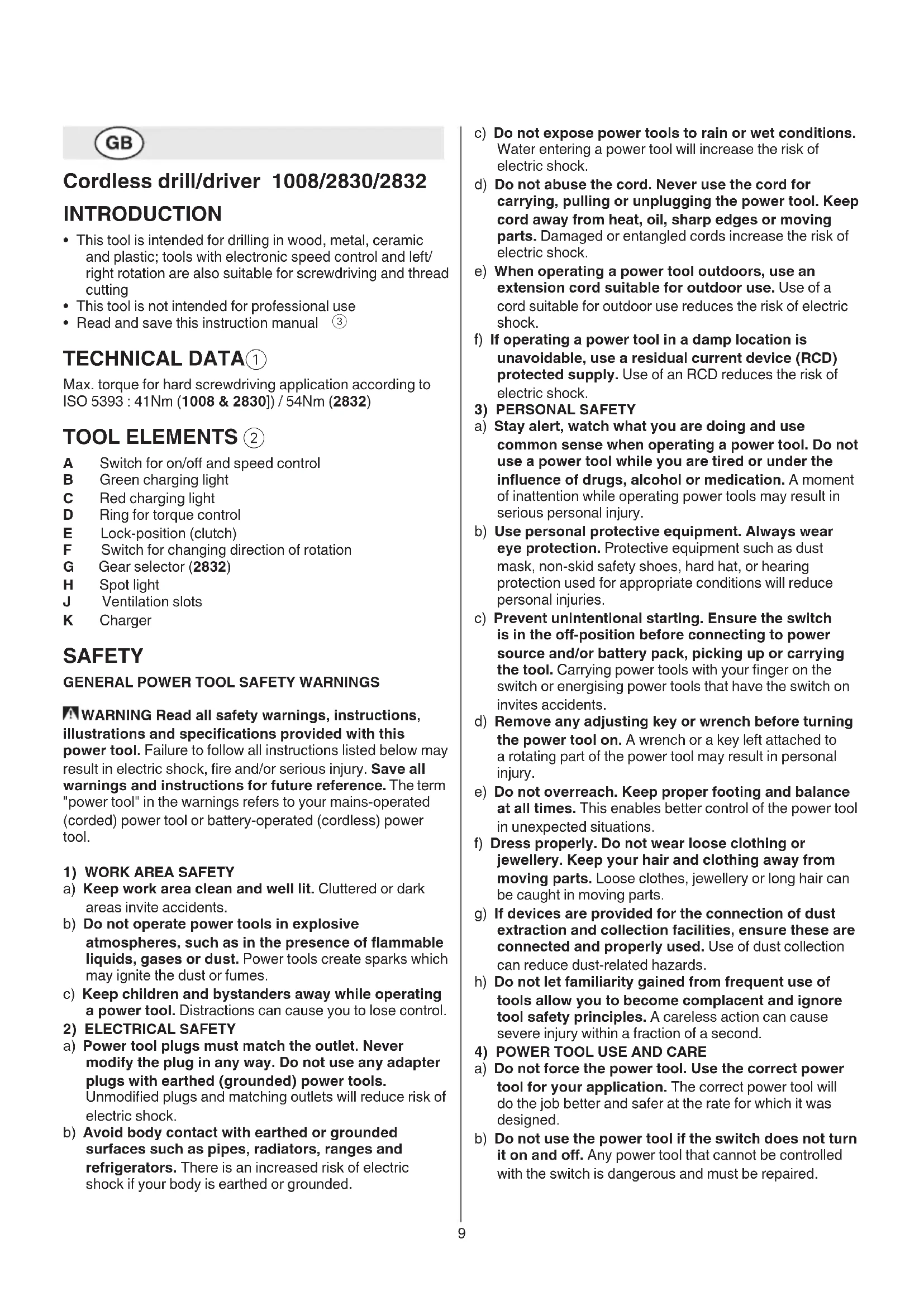 a) Do not force the power tool. Use the correct power tool for your application. The correct power tool will do the job better and safer at the rate for which it was designed. b) Do not use the power tool if the switch does not turn it on and o. Any power tool that cannot be controlled with the switch is dangerous and must be repaired. Cordless drill/driver 1008/2830/2832 INTRODUCTION