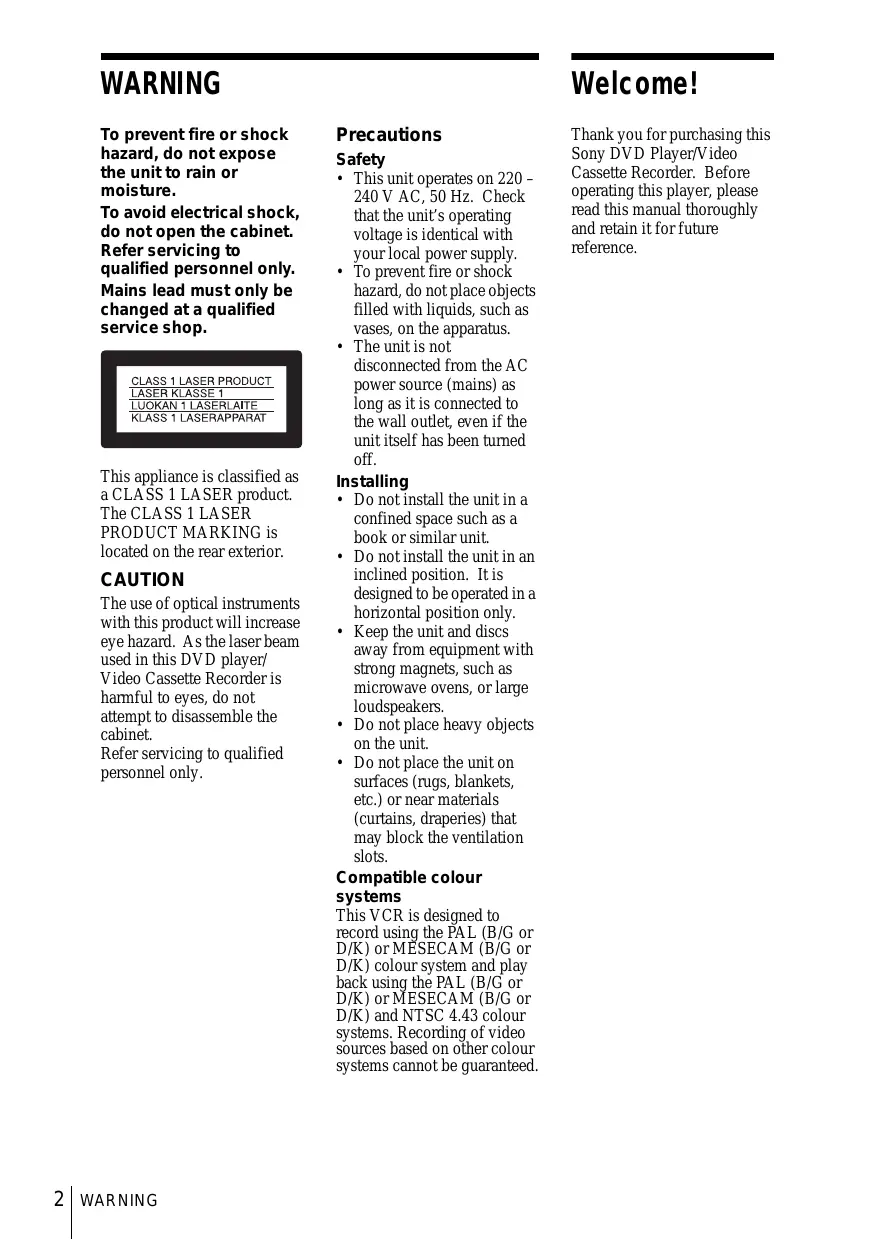 © 2003 Sony Corporation WARNING To prevent fire or shock hazard, do not expose the unit to rain or moisture. To avoid electrical shock, do not open the cabinet. Refer servicing to qualified personnel only. Mains lead must only be changed at a qualified service shop. This appliance is classified as a CLASS 1 LASER product. The CLASS 1 LASER PRODUCT MARKING is located on the rear exterior. CAUTION The use of optical instruments with this product will increase eye hazard. As the laser beam used in this DVD player/ Video Cassette Recorder is harmful to eyes, do not attempt to disassemble the cabinet. Refer servicing to qualified personnel only.