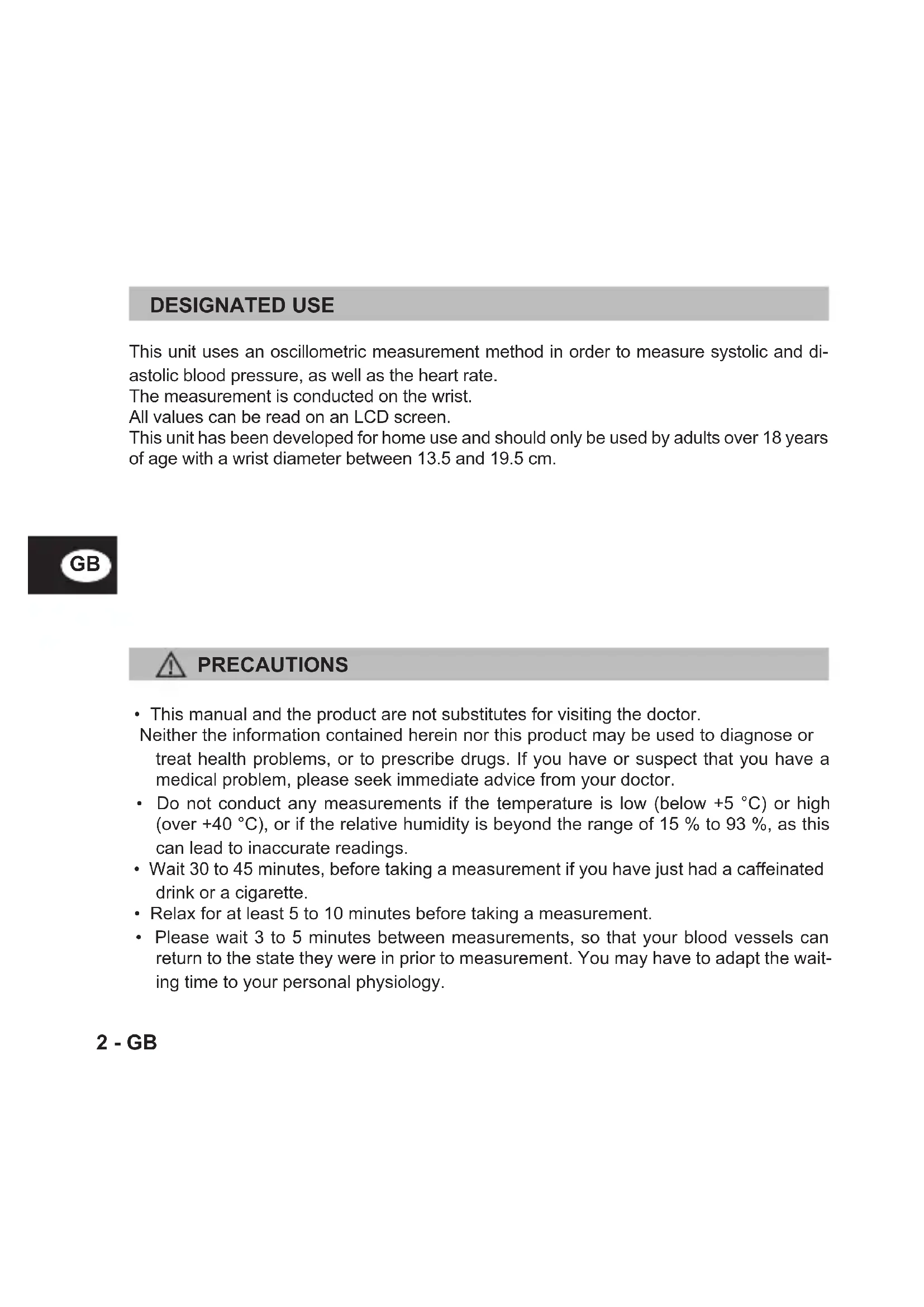 DESIGNATED USE This unit uses an oscillometric measurement method in order to measure systolic and di- astolic blood pressure, as well as the heart rate. The measurement is conducted on the wrist. All values can be read on an LCD screen. This unit has been developed for home use and should only be used by adults over 18 years of age with a wrist diameter between 13.5 and 19.5 cm. PRECAUTIONS