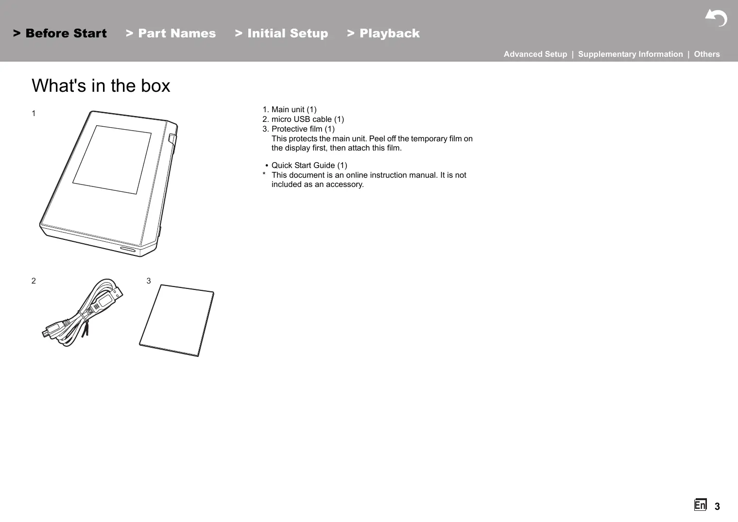 > Initial Setup > Playback Advanced Setup | Supplementary Information | Others Table of Contents Before Start > Initial Setup > Playback Advanced Setup | Supplementary Information | Others What's in the box
