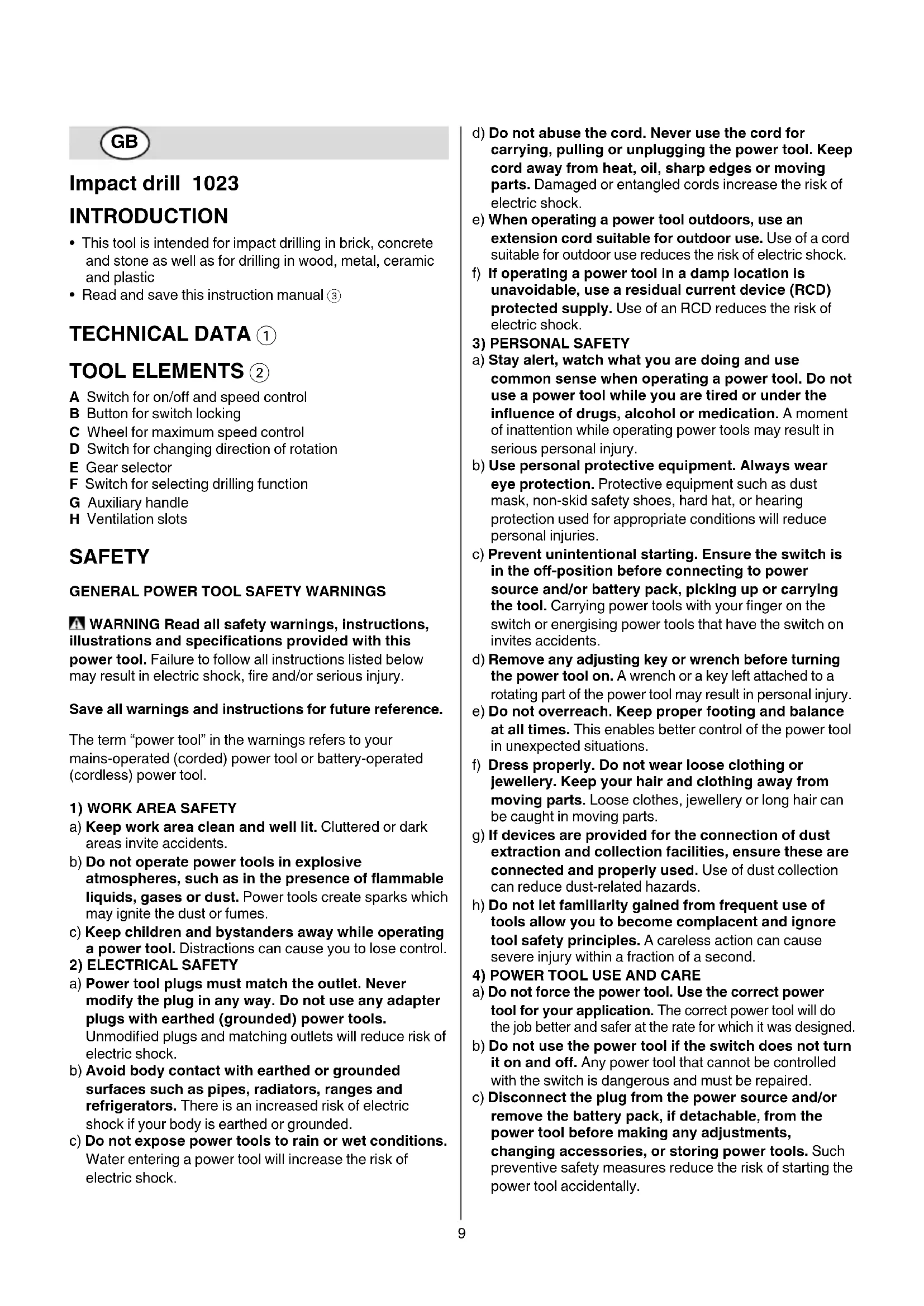 - Read and save this instruction manual 3 TECHNICAL DATA 1 TOOL ELEMENTS 2 A Switch for on/o and speed control B Button for switch locking C Wheel for maximum speed control D Switch for changing direction of rotation E Gear selector F Switch for selecting drilling function G Auxiliary handle H Ventilation slots SAFETY