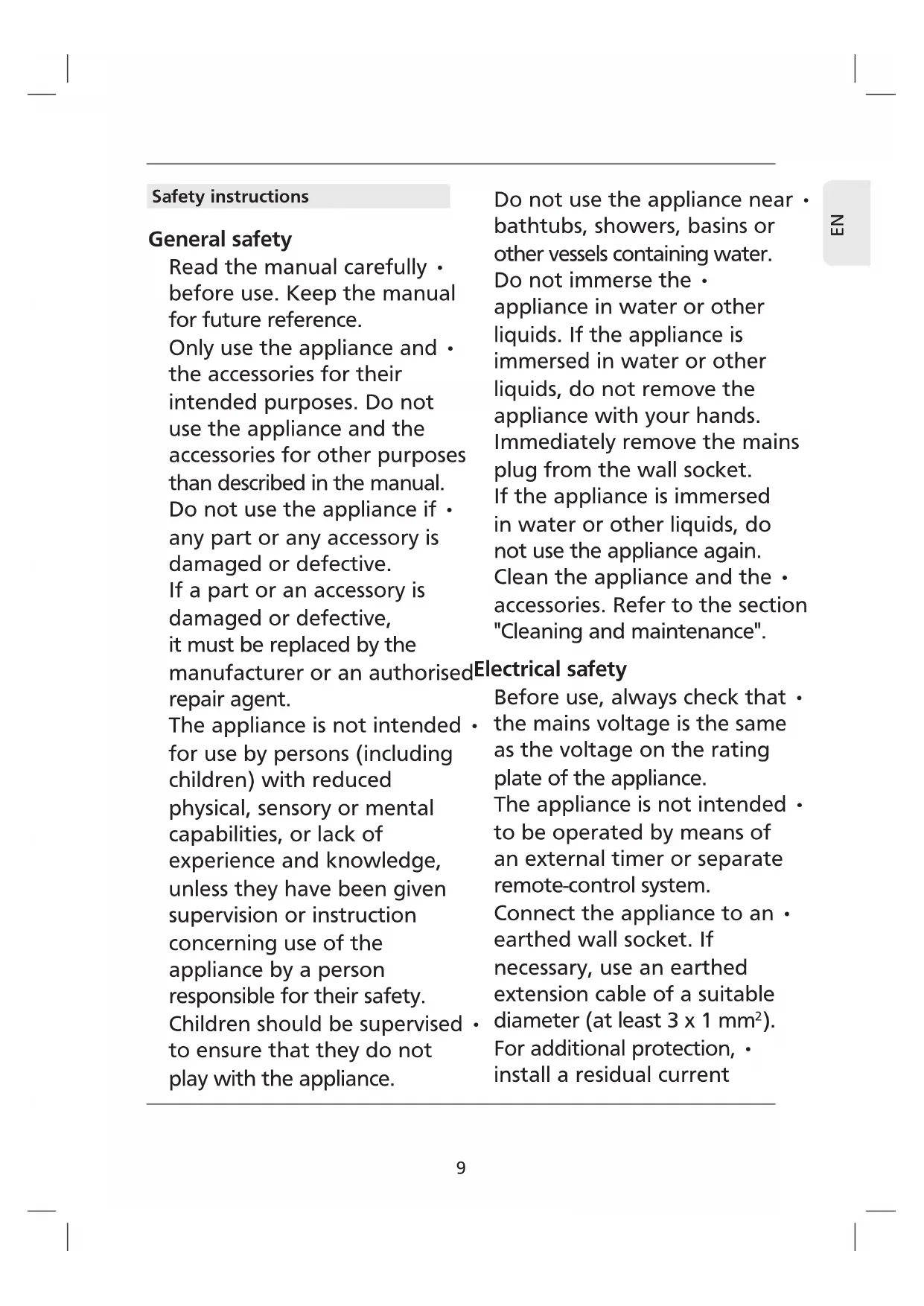 Safety instructions General safety Read the manual carefully • before use. Keep the manual for future reference. Only use the appliance and • the accessories for their intended purposes. Do not use the appliance and the accessories for other purposes than described in the manual. Do not use the appliance if • any part or any accessory is damaged or defective. If a part or an accessory is damaged or defective, it must be replaced by the manufacturer or an authorised repair agent. The appliance is not intended • for use by persons (including children) with reduced physical, sensory or mental capabilities, or lack of experience and knowledge, unless they have been given supervision or instruction concerning use of the appliance by a person responsible for their safety. Children should be supervised • to ensure that they do not play with the appliance. Do not use the appliance near • bathtubs, showers, basins or other vessels containing water. Do not immerse the • appliance in water or other liquids. If the appliance is immersed in water or other liquids, do not remove the appliance with your hands. Immediately remove the mains plug from the wall socket. If the appliance is immersed in water or other liquids, do not use the appliance again. Clean the appliance and the • accessories. Refer to the section "Cleaning and maintenance". Electrical safety Before use, always check that • the mains voltage is the same as the voltage on the rating plate of the appliance. The appliance is not intended • to be operated by means of an external timer or separate remote-control system. Connect the appliance to an • earthed wall socket. If necessary, use an earthed extension cable of a suitable diameter (at least 3 x 1 mm