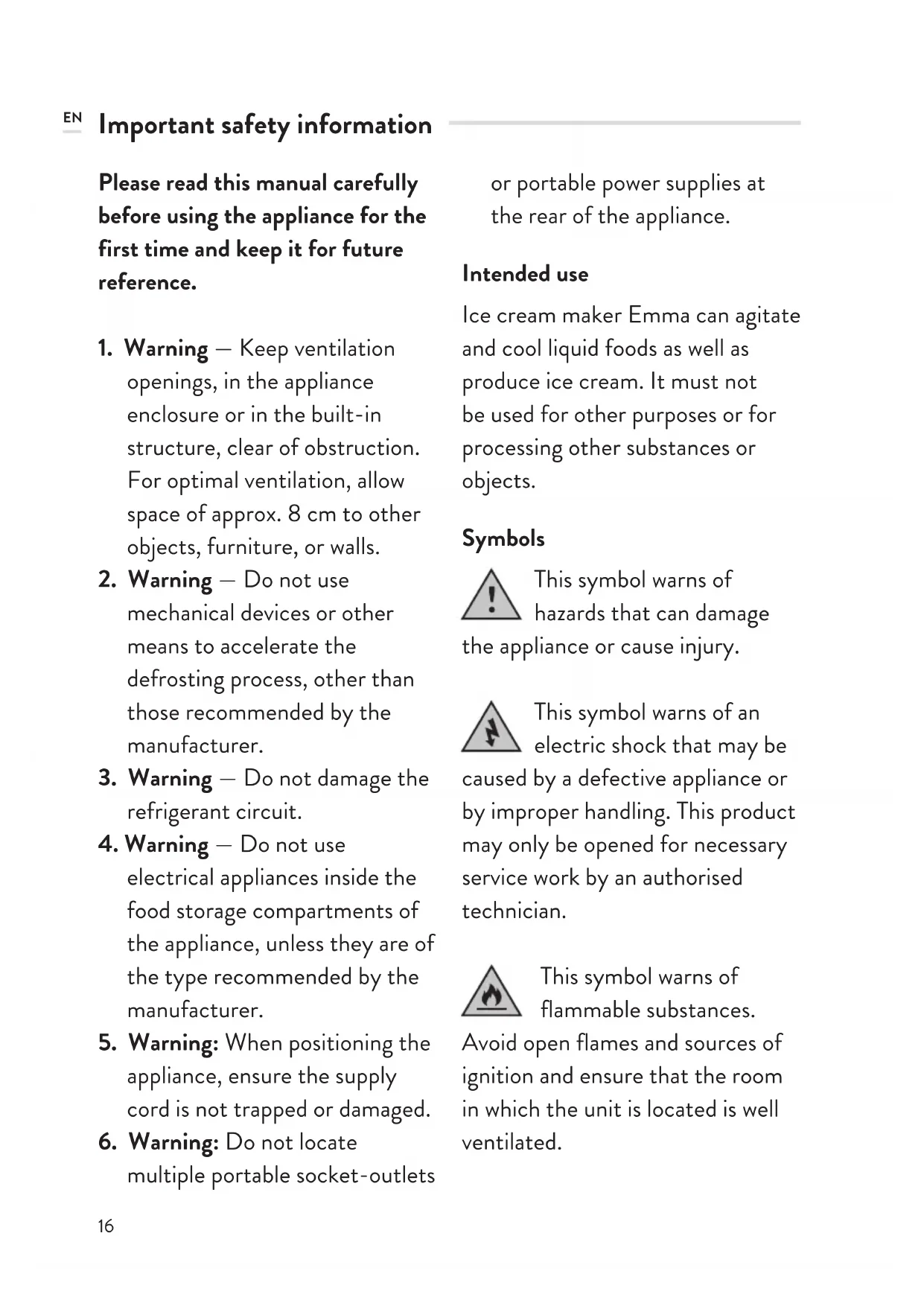 multiple portable socket-outlets or portable power supplies at the rear of the appliance. Intended use Ice cream maker Emma can agitate and cool liquid foods as well as produce ice cream. It must not be used for other purposes or for processing other substances or objects. Symbols This symbol warns of hazards that can damage the appliance or cause injury. This symbol warns of an electric shock that may be caused by a defective appliance or by improper handling. This product may only be opened for necessary service work by an authorised technician. This symbol warns of flammable substances. Avoid open flames and sources of ignition and ensure that the room in which the unit is located is well ventilated. EN17 Safety information Do not store explosive substances such as aerosol containers with flammable propellant gas in this appliance. Do not submerge the appliance in water or any other liquid. Protect the power cable, plug, and mains adaptor from moisture. Do not put your hand into the appliance during operation – this may lead to injury! Make sure that the appliance is never tilted more than 45°, as this could damage the compressor. After unpacking, leave the appliance in its final position for at least 2 hours. The cooling agent inside the appliance must first sink to the bottom, as the compressor could otherwise be damaged. The manufacturer will assume no liability in the event of incorrect assembly, improper or incorrect use, or repairs carried out by unauthorised third parties.