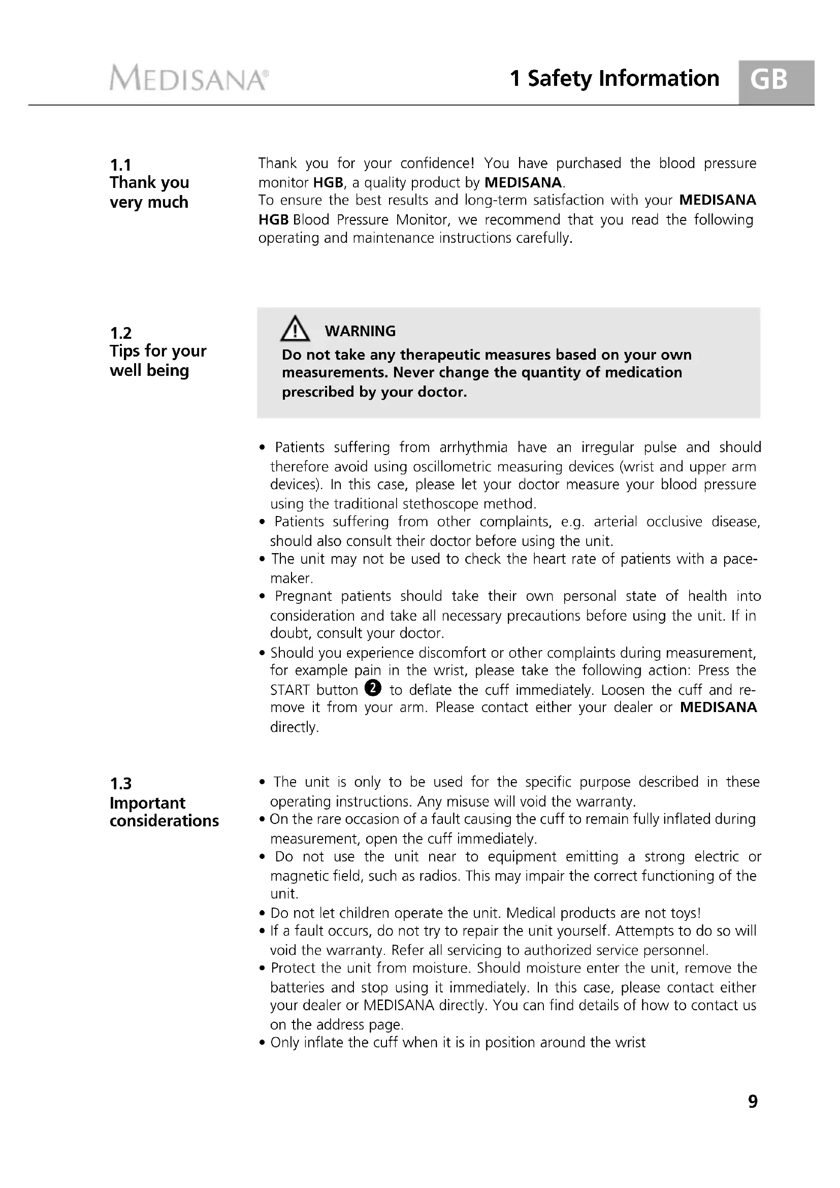 Tips for your well being Thank you for your confidence! You have purchased the blood pressure monitor HGB, a quality product by MEDISANA. To ensure the best results and long-term satisfaction with your MEDISANAHGB Blood Pressure Monitor, we recommend that you read the followingoperating and maintenance instructions carefully.WARNINGDo not take any therapeutic measures based on your own measurements. Never change the quantity of medication prescribed by your doctor.• Patients suffering from arrhythmia have an irregular pulse and shouldtherefore avoid using oscillometric measuring devices (wrist and upper armdevices). In this case, please let your doctor measure your blood pressureusing the traditional stethoscope method.• Patients suffering from other complaints, e.g. arterial occlusive disease,should also consult their doctor before using the unit.• The unit may not be used to check the heart rate of patients with a pace-maker.• Pregnant patients should take their own personal state of health intoconsideration and take all necessary precautions before using the unit. If indoubt, consult your doctor.• Should you experience discomfort or other complaints during measurement,for example pain in the wrist, please take the following action: Press theSTART button to deflate the cuff immediately. Loosen the cuff and re-move it from your arm. Please contact either your dealer or MEDISANAdirectly. • The unit is only to be used for the specific purpose described in theseoperating instructions. Any misuse will void the warranty.• On the rare occasion of a fault causing the cuff to remain fully inflated duringmeasurement, open the cuff immediately.• Do not use the unit near to equipment emitting a strong electric ormagnetic field, such as radios. This may impair the correct functioning of theunit.• Do not let children operate the unit. Medical products are not toys!• If a fault occurs, do not try to repair the unit yourself. Attempts to do so willvoid the warranty. Refer all servicing to authorized service personnel.• Protect the unit from moisture. Should moisture enter the unit, remove thebatteries and stop using it immediately. In this case, please contact eitheryour dealer or MEDISANA directly. You can find details of how to contact uson the address page.• Only inflate the cuff when it is in position around the wrist10 1 Safety Information / 2 Useful Information