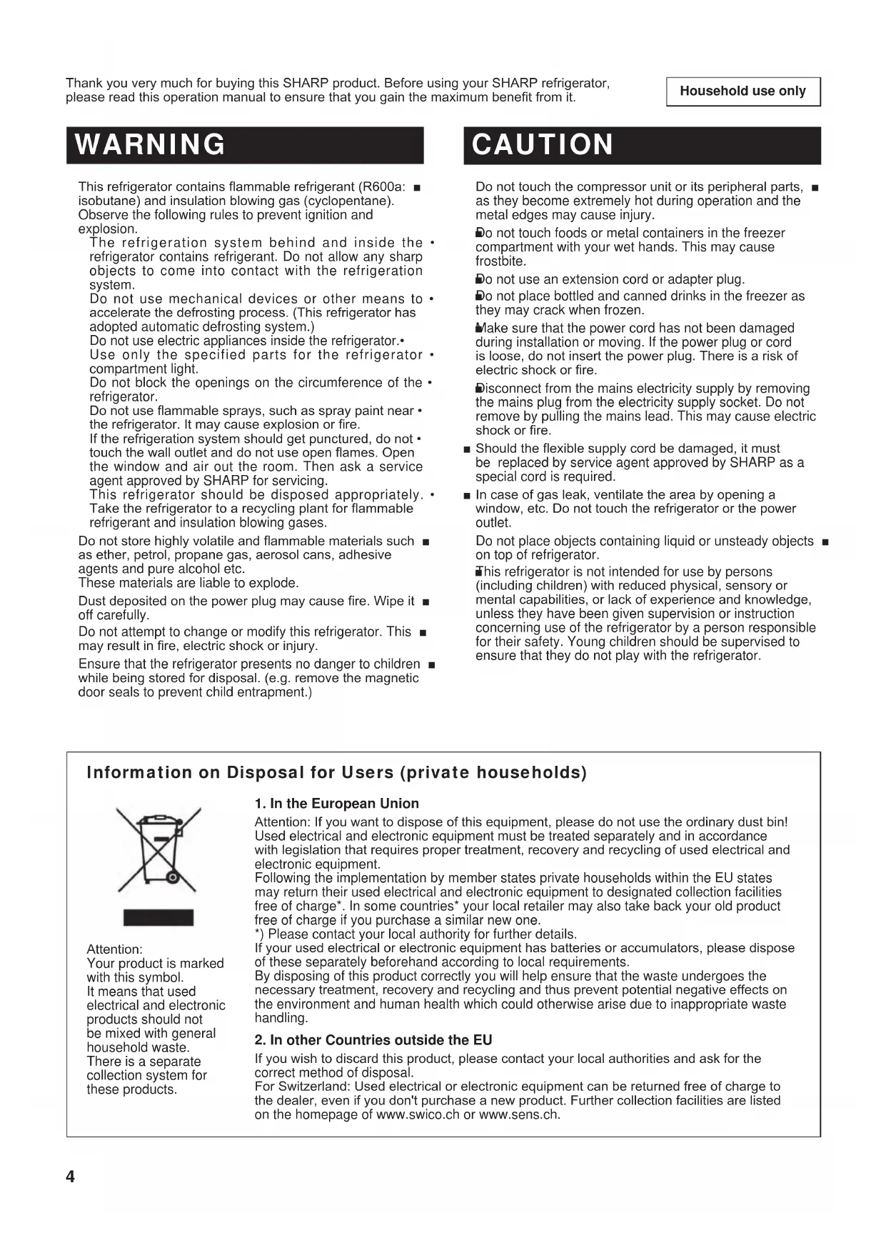 (B246)-W.indb 3 2011/08/30 22:05:124 Household use only Thank you very much for buying this SHARP product. Before using your SHARP refrigerator, please read this operation manual to ensure that you gain the maximum benet from it. This refrigerator contains ammable refrigerant (R600a: ■ isobutane) and insulation blowing gas (cyclopentane). Observe the following rules to prevent ignition and explosion. The refrigeration system behind and inside the • refrigerator contains refrigerant. Do not allow any sharp objects to come into contact with the refrigeration system. Do not use mechanical devices or other means to • accelerate the defrosting process. (This refrigerator has adopted automatic defrosting system.) Do not use electric appliances inside the refrigerator.• Use only the specified parts for the refrigerator • compartment light. Do not block the openings on the circumference of the • refrigerator. Do not use ammable sprays, such as spray paint near • the refrigerator. It may cause explosion or re. If the refrigeration system should get punctured, do not • touch the wall outlet and do not use open ames. Open the window and air out the room. Then ask a service agent approved by SHARP for servicing. This refrigerator should be disposed appropriately. • Take the refrigerator to a recycling plant for ammable refrigerant and insulation blowing gases. Do not store highly volatile and ammable materials such ■ as ether, petrol, propane gas, aerosol cans, adhesive agents and pure alcohol etc. These materials are liable to explode. Dust deposited on the power plug may cause re. Wipe it ■ off carefully. Do not attempt to change or modify this refrigerator. This ■ may result in re, electric shock or injury. Ensure that the refrigerator presents no danger to children ■ while being stored for disposal. (e.g. remove the magnetic door seals to prevent child entrapment.) WARNING CAUTION Do not touch the compressor unit or its peripheral parts, ■ as they become extremely hot during operation and the metal edges may cause injury. Do not touch foods or metal containers in the freezer ■ compartment with your wet hands. This may cause frostbite. Do not use an extension cord or adapter plug. ■ Do not place bottled and canned drinks in the freezer as ■ they may crack when frozen. Make sure that the power cord has not been damaged ■ during installation or moving. If the power plug or cord is loose, do not insert the power plug. There is a risk of electric shock or re. Disconnect from the mains electricity supply by removing ■ the mains plug from the electricity supply socket. Do not remove by pulling the mains lead. This may cause electric shock or re. Should the exible supply cord be damaged, it must ■ be replaced by service agent approved by SHARP as a special cord is required. In case of gas leak, ventilate the area by opening a ■ window, etc. Do not touch the refrigerator or the power outlet. Do not place objects containing liquid or unsteady objects ■ on top of refrigerator. This refrigerator is not intended for use by persons ■ (including children) with reduced physical, sensory or mental capabilities, or lack of experience and knowledge, unless they have been given supervision or instruction concerning use of the refrigerator by a person responsible for their safety. Young children should be supervised to ensure that they do not play with the refrigerator. Information on Disposal for Users (private households)