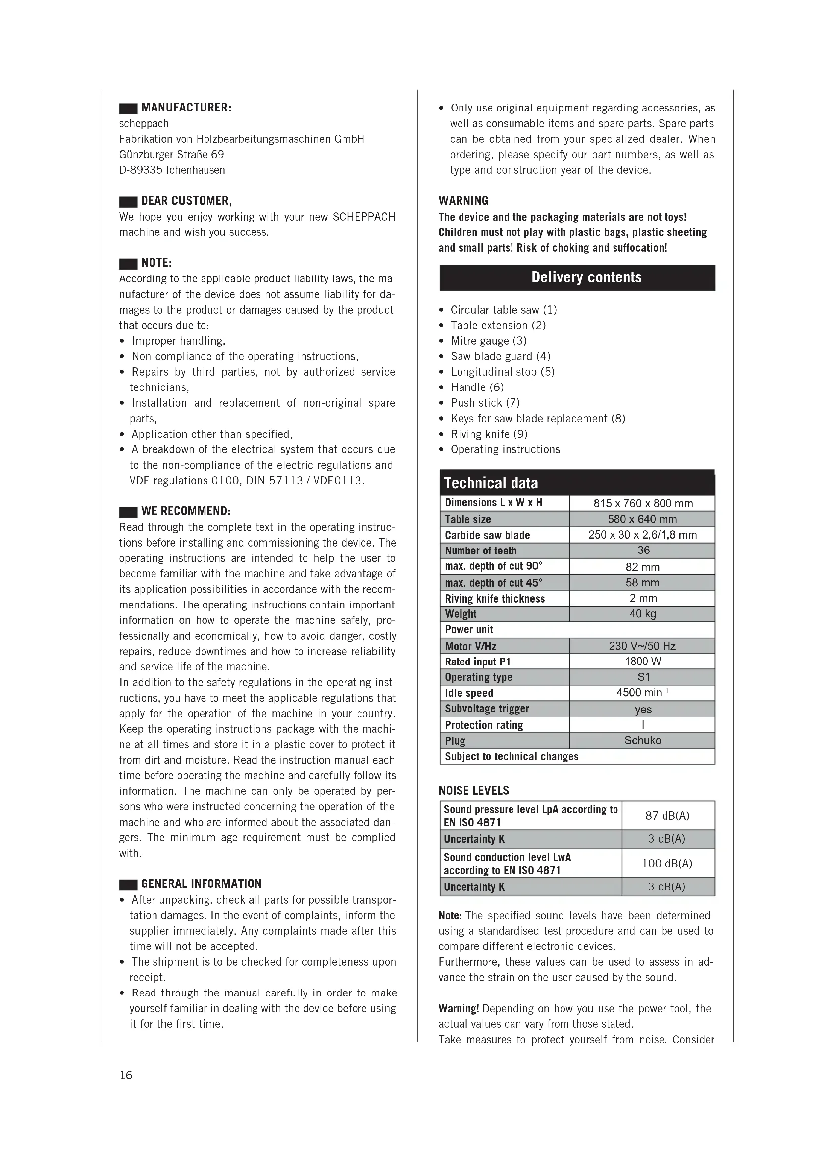 Download the instructions for your Saw in PDF format for free! Find your manual Ts 251 - SCHEPPACH and take your electronic device back in hand. On this page are published all the documents necessary for the use of your device. Ts 251 by SCHEPPACH.