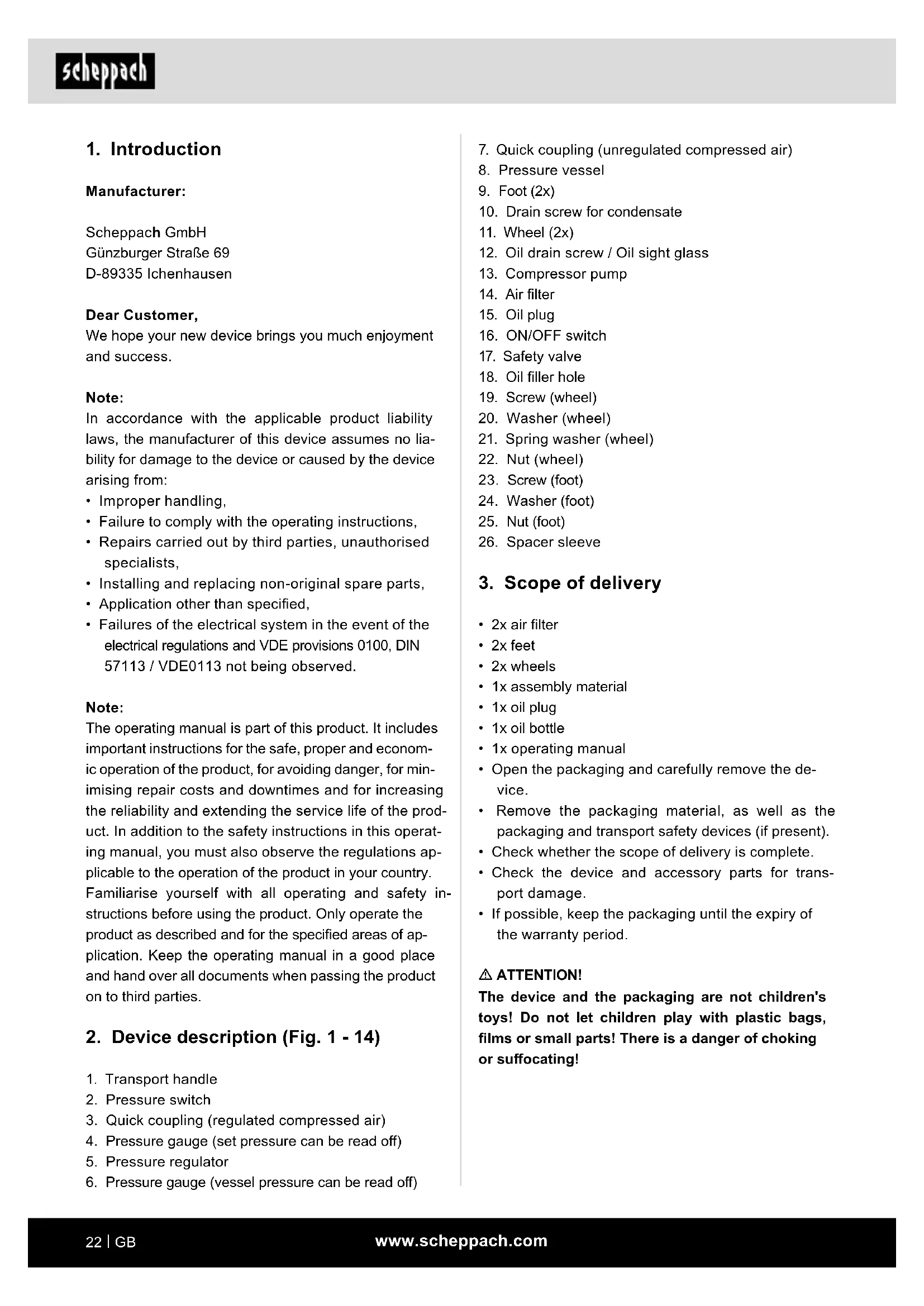Manufacturer: Scheppach GmbH Günzburger Straße 69 D-89335 Ichenhausen Dear Customer, We hope your new device brings you much enjoyment and success. Note: In accordance with the applicable product liability laws, the manufacturer of this device assumes no lia- bility for damage to the device or caused by the device arising from: