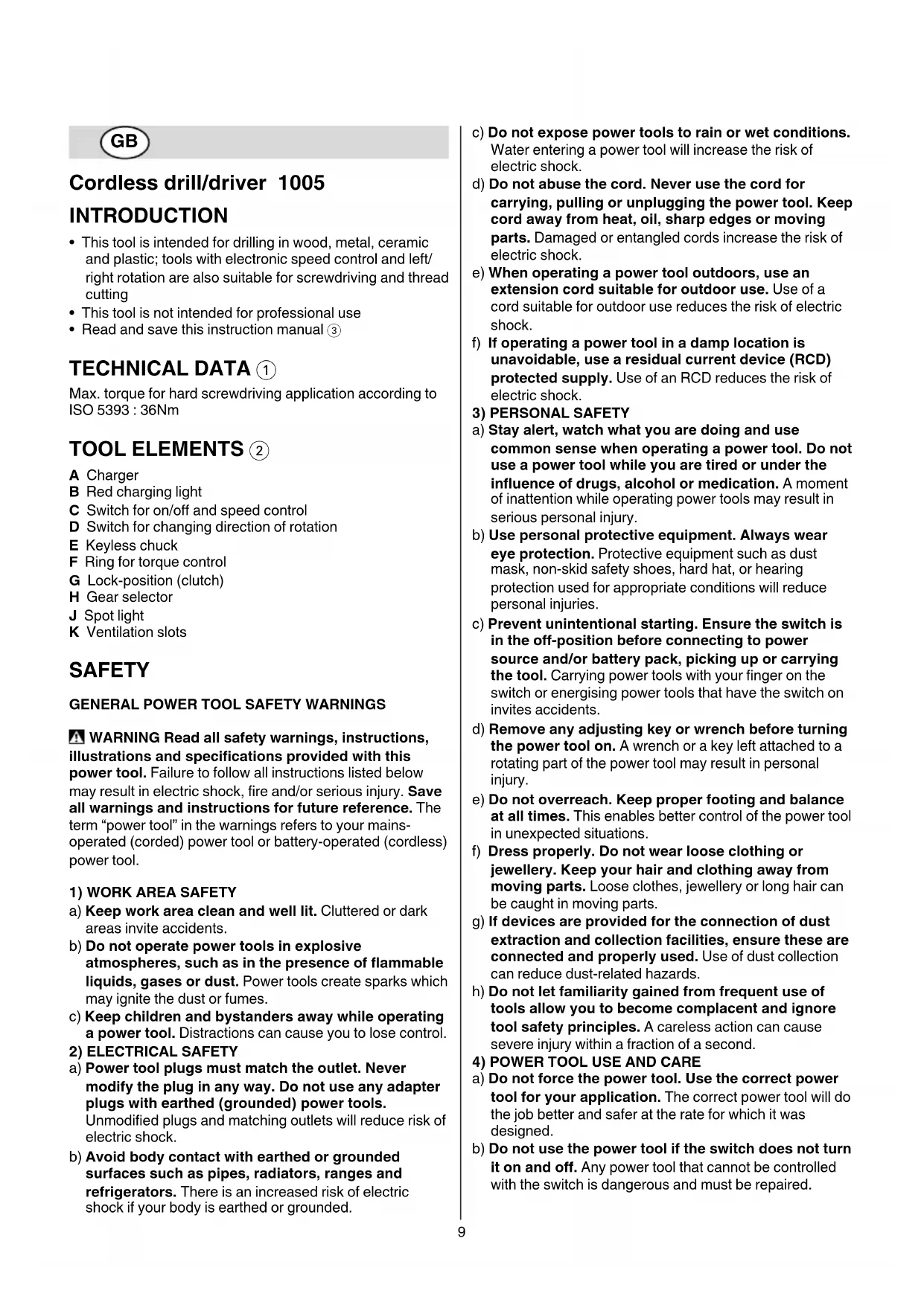 - Read and save this instruction manual 3 TECHNICAL DATA 1 Max. torque for hard screwdriving application according to ISO 5393 : 36Nm TOOL ELEMENTS 2 A Charger B Red charging light C Switch for on/o and speed control D Switch for changing direction of rotation E Keyless chuck F Ring for torque control G Lock-position (clutch) H Gear selector J Spot light K Ventilation slots SAFETY
