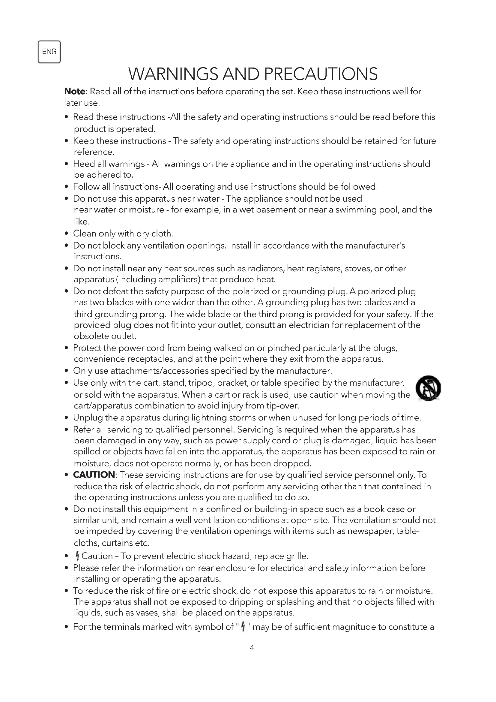 This lightning flash with arrowhead symbol within an equilateral triangle is intended to alert the user to the presence of non-insulated "dangerous voltage" within the product's enclosure that may be of sufficient magnitude to constitute a risk of electric shock. To reduce the risk of electric shock. Do not remove cover (or back). No user serviceable parts inside. Refer to qualified service personnel. The exclamation point within an equilateral triangle is intended to alert the user to the presence of important operating and maintenance instructions in the literature accompanying the appliance.7 ENG