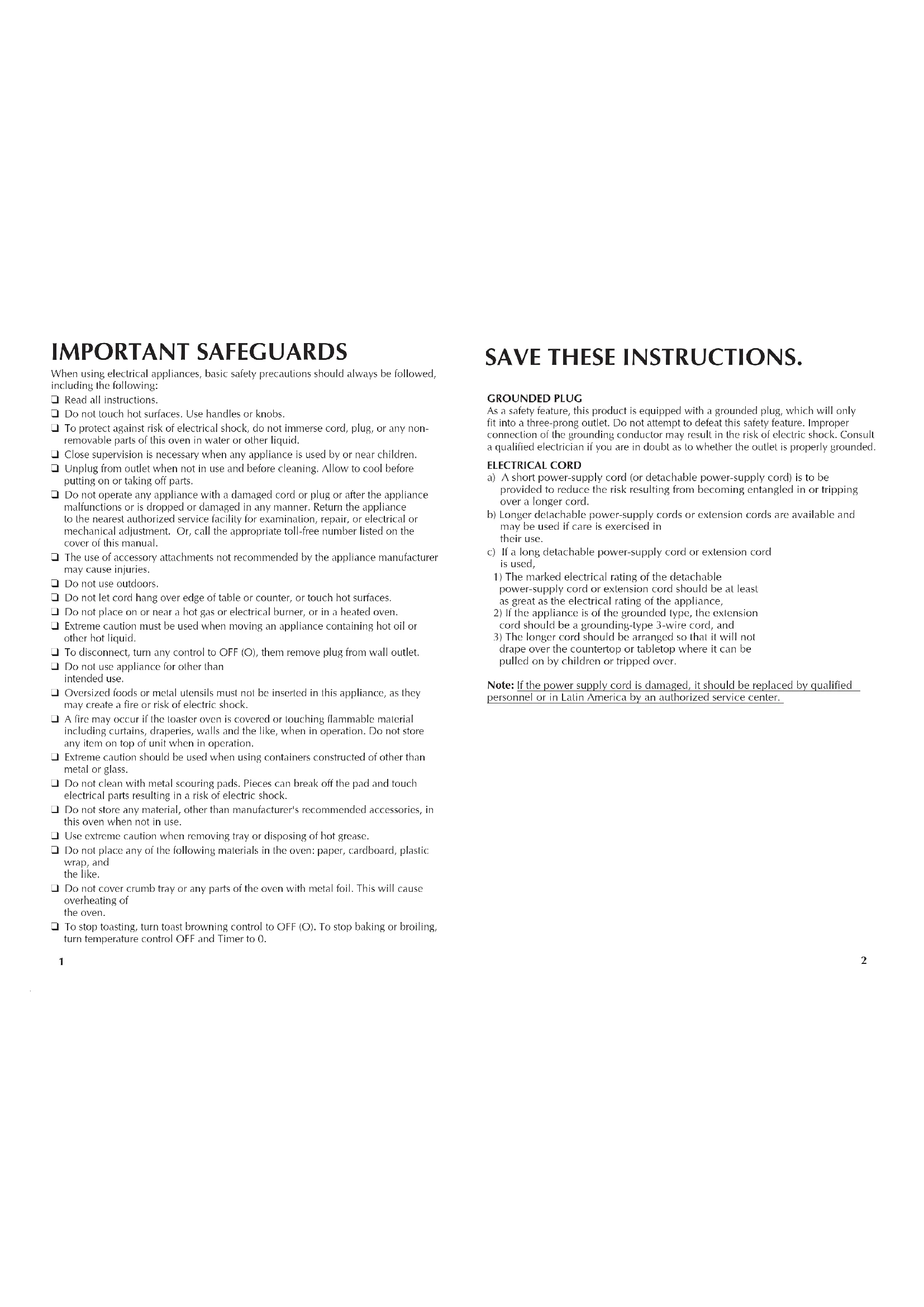 When using electrical appliances, basic safety precautions should always be followed, including the following: ❑ Read all instructions. ❑ Do not touch hot surfaces. Use handles or knobs. ❑ To protect against risk of electrical shock, do not immerse cord, plug, or any non- removable parts of this oven in water or other liquid. ❑ Close supervision is necessary when any appliance is used by or near children. ❑ Unplug from outlet when not in use and before cleaning. Allow to cool before putting on or taking off parts. ❑ Do not operate any appliance with a damaged cord or plug or after the appliance malfunctions or is dropped or damaged in any manner. Return the appliance to the nearest authorized service facility for examination, repair, or electrical or mechanical adjustment. Or, call the appropriate toll-free number listed on the cover of this manual. ❑ The use of accessory attachments not recommended by the appliance manufacturer may cause injuries. ❑ Do not use outdoors. ❑ Do not let cord hang over edge of table or counter, or touch hot surfaces. ❑ Do not place on or near a hot gas or electrical burner, or in a heated oven. ❑ Extreme caution must be used when moving an appliance containing hot oil or other hot liquid. ❑ To disconnect, turn any control to OFF (O), them remove plug from wall outlet. ❑ Do not use appliance for other than intended use. ❑ Oversized foods or metal utensils must not be inserted in this appliance, as they may create a fire or risk of electric shock. ❑ A fire may occur if the toaster oven is covered or touching flammable material including curtains, draperies, walls and the like, when in operation. Do not store any item on top of unit when in operation. ❑ Extreme caution should be used when using containers constructed of other than metal or glass. ❑ Do not clean with metal scouring pads. Pieces can break off the pad and touch electrical parts resulting in a risk of electric shock. ❑ Do not store any material, other than manufacturer's recommended accessories, in this oven when not in use. ❑ Use extreme caution when removing tray or disposing of hot grease. ❑ Do not place any of the following materials in the oven: paper, cardboard, plastic wrap, and the like. ❑ Do not cover crumb tray or any parts of the oven with metal foil. This will cause overheating of the oven. ❑ To stop toasting, turn toast browning control to OFF (O). To stop baking or broiling, turn temperature control OFF and Timer to 0. IMPORTANT SAFEGUARDS SAVE THESE INSTRUCTIONS. GROUNDED PLUG As a safety feature, this product is equipped with a grounded plug, which will only fit into a three-prong outlet. Do not attempt to defeat this safety feature. Improper connection of the grounding conductor may result in the risk of electric shock. Consult a qualified electrician if you are in doubt as to whether the outlet is properly grounded. ELECTRICAL CORD a) A short power-supply cord (or detachable power-supply cord) is to be provided to reduce the risk resulting from becoming entangled in or tripping over a longer cord. b) Longer detachable power-supply cords or extension cords are available and may be used if care is exercised in their use. c) If a long detachable power-supply cord or extension cord is used,