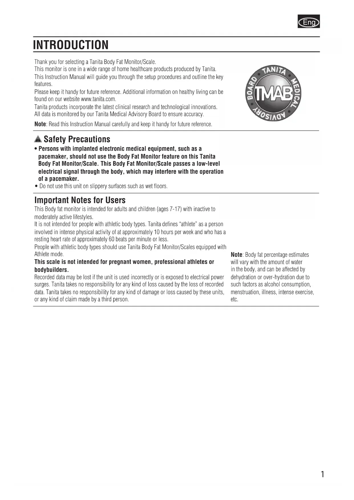 - Do not use this unit on slippery surfaces such as wet floors. Important Notes for Users This Body fat monitor is intended for adults and children (ages 7-17) with inactive to moderately active lifestyles. It is not intended for people with athletic body types. Tanita defines “athlete” as a person involved in intense physical activity of at approximately 10 hours per week and who has a resting heart rate of approximately 60 beats per minute or less. People with athletic body types should use Tanita Body Fat Monitor/Scales equipped with Athlete mode. This scale is not intended for pregnant women, professional athletes or bodybuilders. Recorded data may be lost if the unit is used incorrectly or is exposed to electrical power surges. Tanita takes no responsibility for any kind of loss caused by the loss of recorded data. Tanita takes no responsibility for any kind of damage or loss caused by these units, or any kind of claim made by a third person. Note: Body fat percentage estimates will vary with the amount of water in the body, and can be affected by dehydration or over-hydration due to such factors as alcohol consumption, menstruation, illness, intense exercise, etc.2 Eng