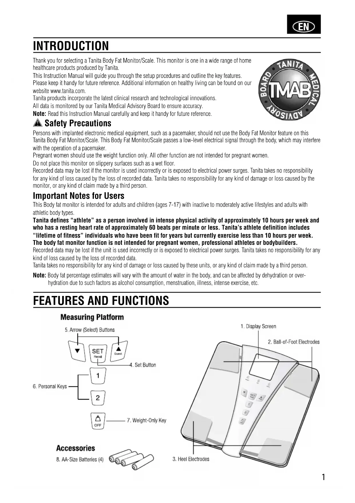 Thank you for selecting a Tanita Body Fat Monitor/Scale. This monitor is one in a wide range of home healthcare products produced by Tanita. This Instruction Manual will guide you through the setup procedures and outline the key features. Please keep it handy for future reference. Additional information on healthy living can be found on our website www.tanita.com. Tanita products incorporate the latest clinical research and technological innovations. All data is monitored by our Tanita Medical Advisory Board to ensure accuracy. Note: Read this Instruction Manual carefully and keep it handy for future reference. Safety Precautions Persons with implanted electronic medical equipment, such as a pacemaker, should not use the Body Fat Monitor feature on this Tanita Body Fat Monitor/Scale. This Body Fat Monitor/Scale passes a low-level electrical signal through the body, which may interfere with the operation of a pacemaker. Pregnant women should use the weight function only. All other function are not intended for pregnant women. Do not place this monitor on slippery surfaces such as a wet floor. Recorded data may be lost if the monitor is used incorrectly or is exposed to electrical power surges. Tanita takes no responsibility for any kind of loss caused by the loss of recorded data. Tanita takes no responsibility for any kind of damage or loss caused by the monitor, or any kind of claim made by a third person. Important Notes for Users This Body fat monitor is intended for adults and children (ages 7-17) with inactive to moderately active lifestyles and adults with athletic body types. Tanita defines “athlete” as a person involved in intense physical activity of approximately 10 hours per week and who has a resting heart rate of approximately 60 beats per minute or less. Tanita’s athlete definition includes “lifetime of fitness” individuals who have been fit for years but currently exercise less than 10 hours per week. The body fat monitor function is not intended for pregnant women, professional athletes or bodybuilders. Recorded data may be lost if the unit is used incorrectly or is exposed to electrical power surges. Tanita takes no responsibility for any kind of loss caused by the loss of recorded data. Tanita takes no responsibility for any kind of damage or loss caused by these units, or any kind of claim made by a third person. Note: Body fat percentage estimates will vary with the amount of water in the body, and can be affected by dehydration or over- hydration due to such factors as alcohol consumption, menstruation, illness, intense exercise, etc. INTRODUCTION