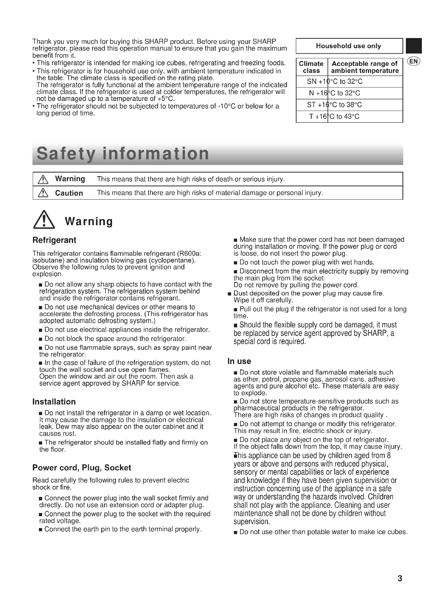 - The refrigerator should not be subjected to temperatures of -10°C or below for a long period of time. Refrigerant This refrigerator contains ammable refrigerant (R600a: isobutane) and insulation blowing gas (cyclopentane). Observe the following rules to prevent ignition and explosion. ■ Do not allow any sharp objects to have contact with the refrigeration system. The refrigeration system behind and inside the refrigerator contains refrigerant. ■ Do not use mechanical devices or other means to accelerate the defrosting process. (This refrigerator has adopted automatic defrosting system.) ■ Do not use electrical appliances inside the refrigerator. ■ Do not block the space around the refrigerator. ■ Do not use ammable sprays, such as spray paint near the refrigerator. ■ In the case of failure of the refrigeration system, do not touch the wall socket and use open ames. Open the window and air out the room. Then ask a service agent approved by SHARP for service. Installation ■ Do not install the refrigerator in a damp or wet location. It may cause the damage to the insulation or electrical leak. Dew may also appear on the outer cabinet and it causes rust. ■ The refrigerator should be installed atly and rmly on the oor. Power cord, Plug, Socket Read carefully the following rules to prevent electric shock or re. ■ Connect the power plug into the wall socket rmly and directly. Do not use an extension cord or adapter plug. ■ Connect the power plug to the socket with the required rated voltage. ■ Connect the earth pin to the earth terminal properly. ■ Make sure that the power cord has not been damaged during installation or moving. If the power plug or cord is loose, do not insert the power plug. ■ Do not touch the power plug with wet hands. ■ Disconnect from the main electricity supply by removing the main plug from the socket. Do not remove by pulling the power cord. ■ Dust deposited on the power plug may cause re. Wipe it off carefully. ■ Pull out the plug if the refrigerator is not used for a long time. ■ Should the exible supply cord be damaged, it must be replaced by service agent approved by SHARP, a special cord is required. In use ■ Do not store volatile and ammable materials such as ether, petrol, propane gas, aerosol cans, adhesive agents and pure alcohol etc. These materials are easy to explode. ■ Do not store temperature-sensitive products such as pharmaceutical products in the refrigerator. There are high risks of changes in product quality . ■ Do not attempt to change or modify this refrigerator. This may result in re, electric shock or injury. ■ Do not place any object on the top of refrigerator. If the object falls down from the top, it may cause injury.