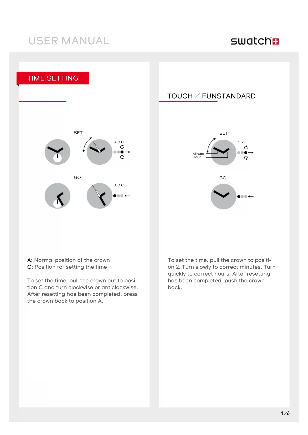 USER MANUAL LOREM IPSUM 1/6 TOUCH / FUNSTANDARD TIME SETTING A: Normal position of the crown C: Position for setting the time To set the time, pull the crown out to posi- tion C and turn clockwise or anticlockwise. After resetting has been completed, press the crown back to position A. To set the time, pull the crown to positi- on 2. Turn slowly to correct minutes. Turn quickly to correct hours. After resetting has been completed, push the crown back. SET A B CA B C