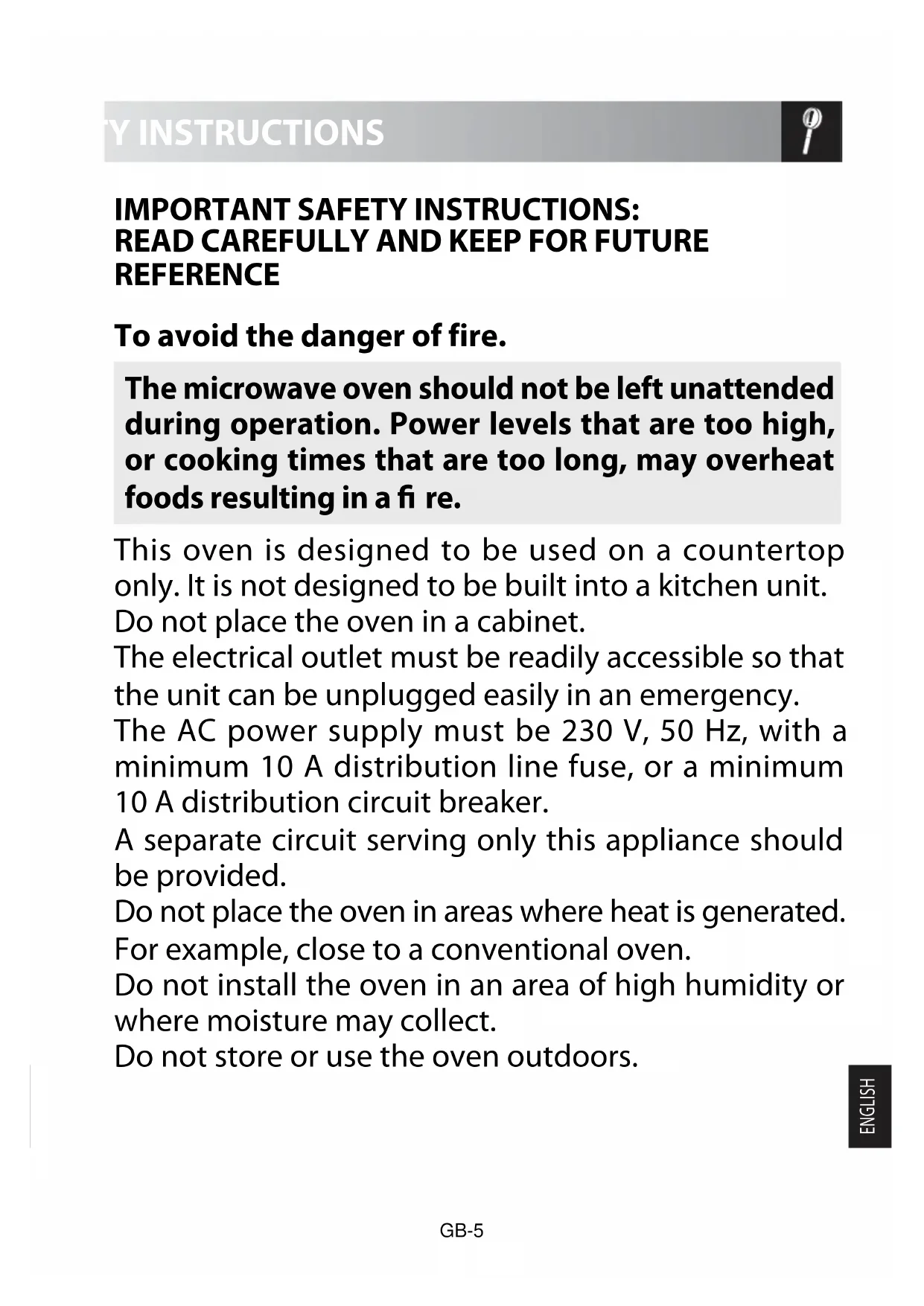 To avoid the danger of fire. The microwave oven should not be left unattended during operation. Power levels that are too high, or cooking times that are too long, may overheat foods resulting in a re. This oven is designed to be used on a countertop only. It is not designed to be built into a kitchen unit. Do not place the oven in a cabinet. The electrical outlet must be readily accessible so that the unit can be unplugged easily in an emergency. The AC power supply must be 230 V, 50 Hz, with a minimum 10 A distribution line fuse, or a minimum 10 A distribution circuit breaker. A separate circuit serving only this appliance should be provided. Do not place the oven in areas where heat is generated. For example, close to a conventional oven. Do not install the oven in an area of high humidity or where moisture may collect. Do not store or use the oven outdoors. IMPORTANT SAFETY INSTRUCTIONS: