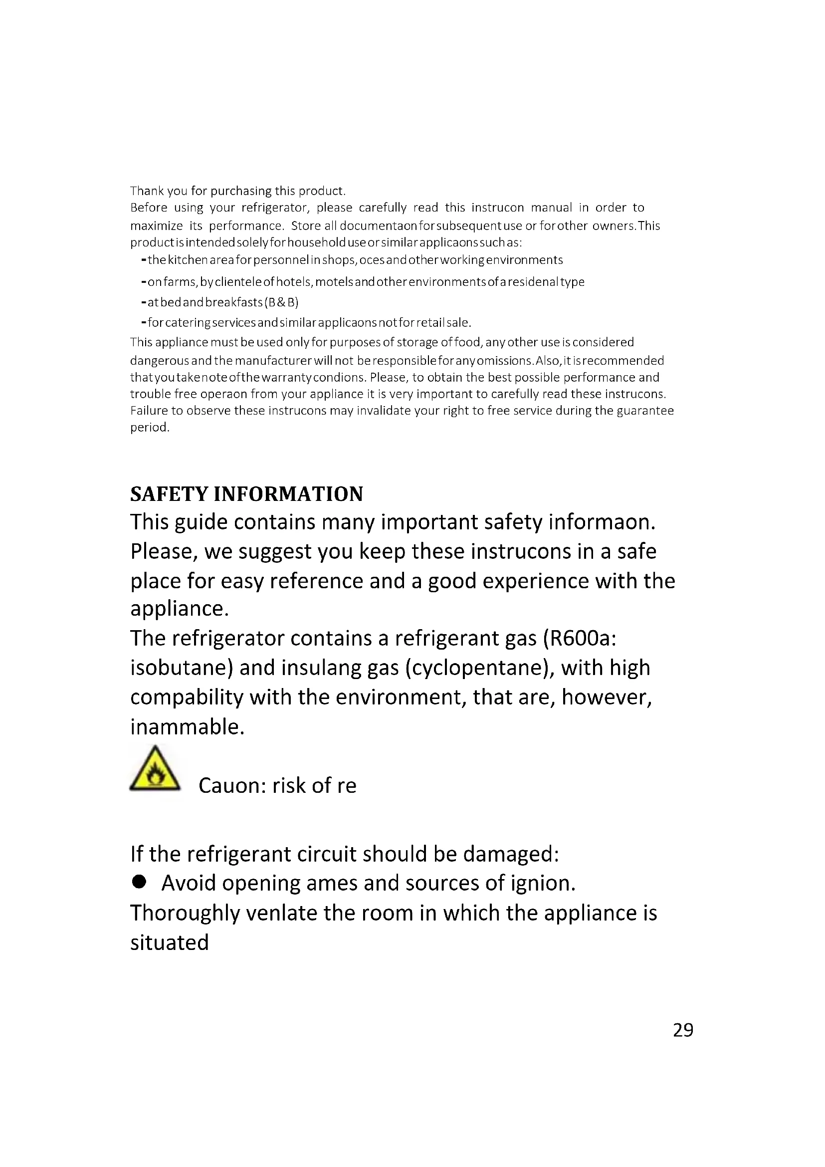 Thank you for purchasing this product. Before using your refrigerator, please carefully read this instruction manual in order to maximize its performance. Store all documentation for subsequent use or for other owners. This product is intended solely for household use or similar applications such as: - the kitchen area for personnel in shops, offices and other working environments - on farms, by clientele of hotels, motels and other environments of a residential type - at bed and breakfasts (B & B) - for catering services and similar applications not for retail sale. This appliance must be used only for purposes of storage of food, any other use is considered dangerous and the manufacturer will not be responsible for any omissions. Also, it is recommended that you take note of the warranty conditions. Please, to obtain the best possible performance and trouble free operation from your appliance it is very important to carefully read these instructions. Failure to observe these instructions may invalidate your right to free service during the guarantee period. SAFETY INFORMATION This guide contains many important safety information. Please, we suggest you keep these instructions in a safe place for easy reference and a good experience with the appliance. The refrigerator contains a refrigerant gas (R600a: isobutane) and insulating gas (cyclopentane), with high compatibility with the environment, that are, however, inflammable. Caution: risk of fire If the refrigerant circuit should be damaged: Avoid opening flames and sources of ignition. Thoroughly ventilate the room in which the appliance is situated Percentage running30 WARNING! Care must be taken while cleaning/carrying the appliance to avoid touching the condenser metal wires at the back of the appliance, as you might injure your fingers and hands or damage your product. This appliance is not designed for stacking with any other appliance. Do not attempt to sit or stand on top of your appliance as it is not designed for such use. You could injure yourself or damage the appliance. Make sure that mains cable is not caught under the appliance during and after carrying/moving the appliance, to avoid the mains cable becoming cut or damaged. When positioning your appliance take care not to damage your flooring, pipes, wall coverings etc. Do not move the appliance by pulling by the lid or handle. Do not allow children to play with the appliance or tamper with the controls. Our company declines to accept any liability should the instructions not be followed. Do not install the appliance in humid, oily or dusty places, nor expose it to direct sunlight and to water. Do not install the appliance near heaters or inflammable materials. If there is a power failure do not open the lid.31 Frozen food should not be affected if the failure lasts for less than 20 hours. If the failure is longer, then the food should be checked and eaten immediately or cooked and then refrozen. If you find that the lid of the chest freezer is difficult to open just after you have closed it, don’t worry. This is due to the pressure difference which will equalize and allow the lid to be opened normally after a few minutes. Do not connect the appliance to the electricity supply until all packing and transit protectors have been removed. Leave to stand for at least 4 hours before switching on to allow compressor oil to settle if transported horizontally. This freezer must only be used for its intended purpose (i.e. storing and freezing of edible foodstuff). Do not store medicine or research materials in the Wine Coolers. When the material that requires a strict control of storage temperatures is to be stored, it is possible that it will deteriorate or an uncontrolled reaction may occur that can cause risks. Before performing any operation, unplug the power cord from the power socket. On delivery, check to make sure that the product is not damaged and that all the parts and accessories32 are in perfect condition. If in the refrigeration system a leak is noted, do not touch the wall outlet and do not use open flames. Open the window and let air into the room. Then call a service center to ask for repair. Do not use extension cords or adapters. Do not excessively pull or fold the power cord or touch the plug with wet hands. Do not damage the plug and/or the power cord; this could cause electrical shocks or fires. If the supply cord is damaged, it must be replaced by the manufacturer, its service agent or similarly qualified person in order to avoid a hazard. Do not place or store inflammable and highly volatile materials such as ether, petrol, LPG, propane gas, aerosol spray cans, adhesives, pure alcohol, etc. These materials may cause an explosion. Do not use or store inflammable sprays, such as spray paint, near the Wine Coolers. It could cause an explosion or fire. Do not place objects and/or containers filled with water on the top of the appliance. We do not recommend the use of extension leads and multi-way adapters. Do not dispose of the appliance on a fire. Take care not to damage, the cooling circuit/pipes of the appliance in transportation and in use. In case of33 damage do not expose the appliance to fire, potential ignition source and immediately ventilate the room where the appliance is situated. The refrigeration system positioned behind and inside the Wine Coolers contains refrigerant. Therefore, avoid damaging the tubes. Do not use electrical appliances inside the food storage compartments of the appliance, unless they are of the type recommended by the manufacturer. Do not damage the refrigerant circuit. Do not use mechanical devices or other means to accelerate the defrosting process, other than those recommended by the manufacturer. Do not use electrical appliances inside the food storage compartments, unless they are of the type recommended by the manufacturer. Do not touch internal cooling elements, especially with wet hands, to avoid cracks or injuries. 