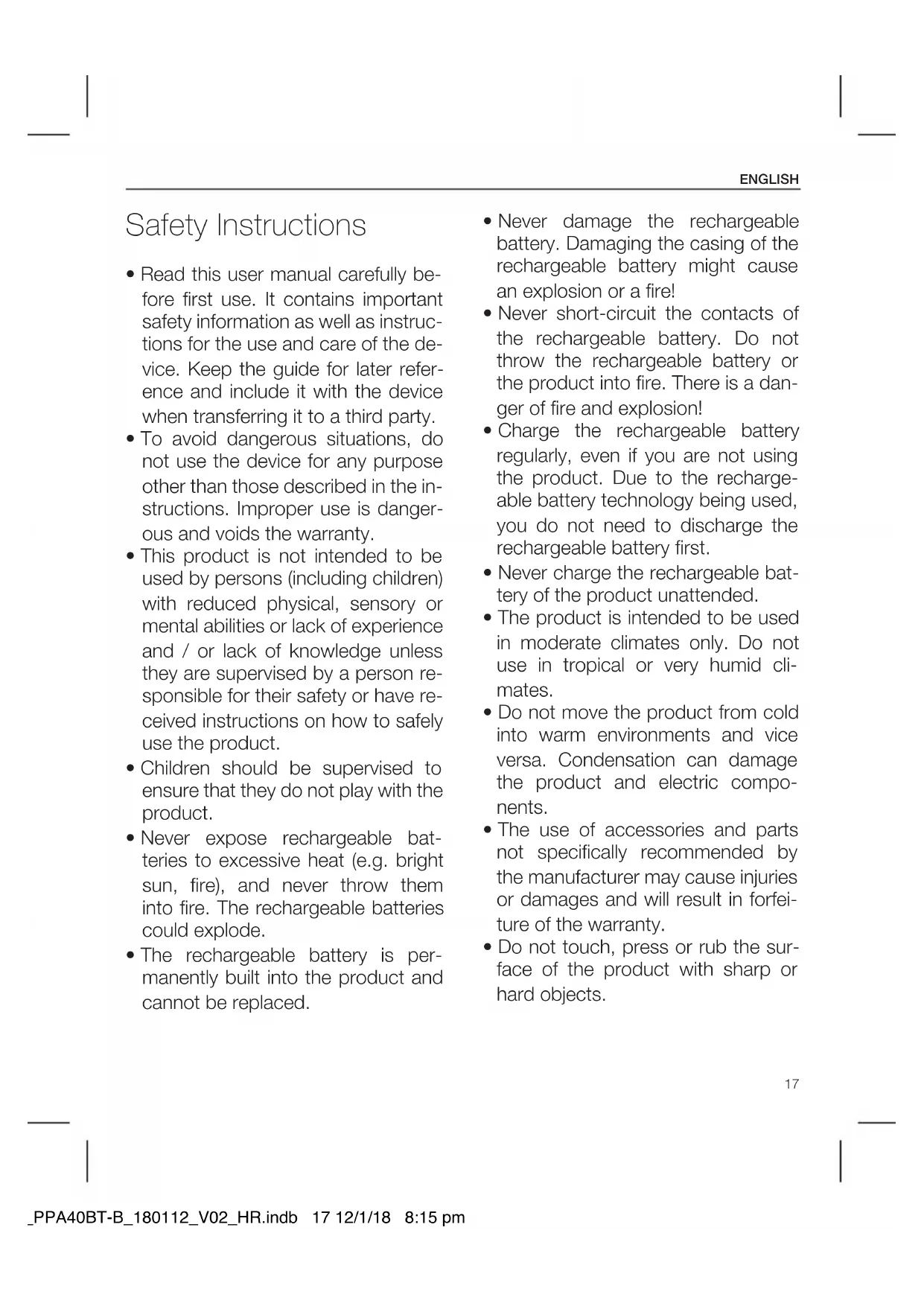 - LED turns o: Battery charging complete. IM_PPA40BT-B_180112_V02_HR.indb 20 12/1/18 8:15 pm21 ENGLISH