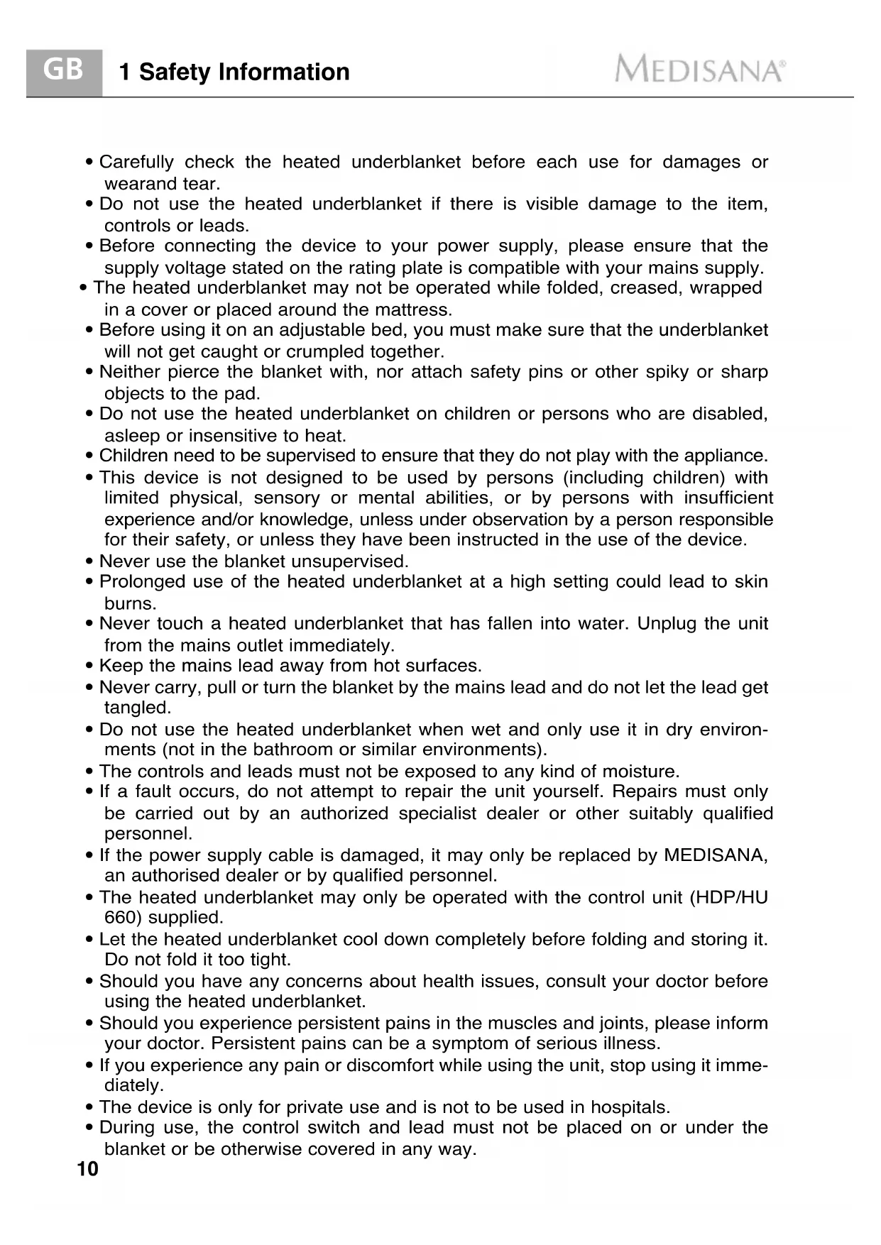 Operating 2 Operating Thank you very much for your confidence in us and congratulations! With this Double Size Heated Underblanket HU 660 you have purchased a quality product by MEDISANA. To ensure the best results and long-term satisfaction with your MEDISANA Double Size Heated Underblanket HU 660, we recommend that you read the following operating and maintenance instructions carefully.