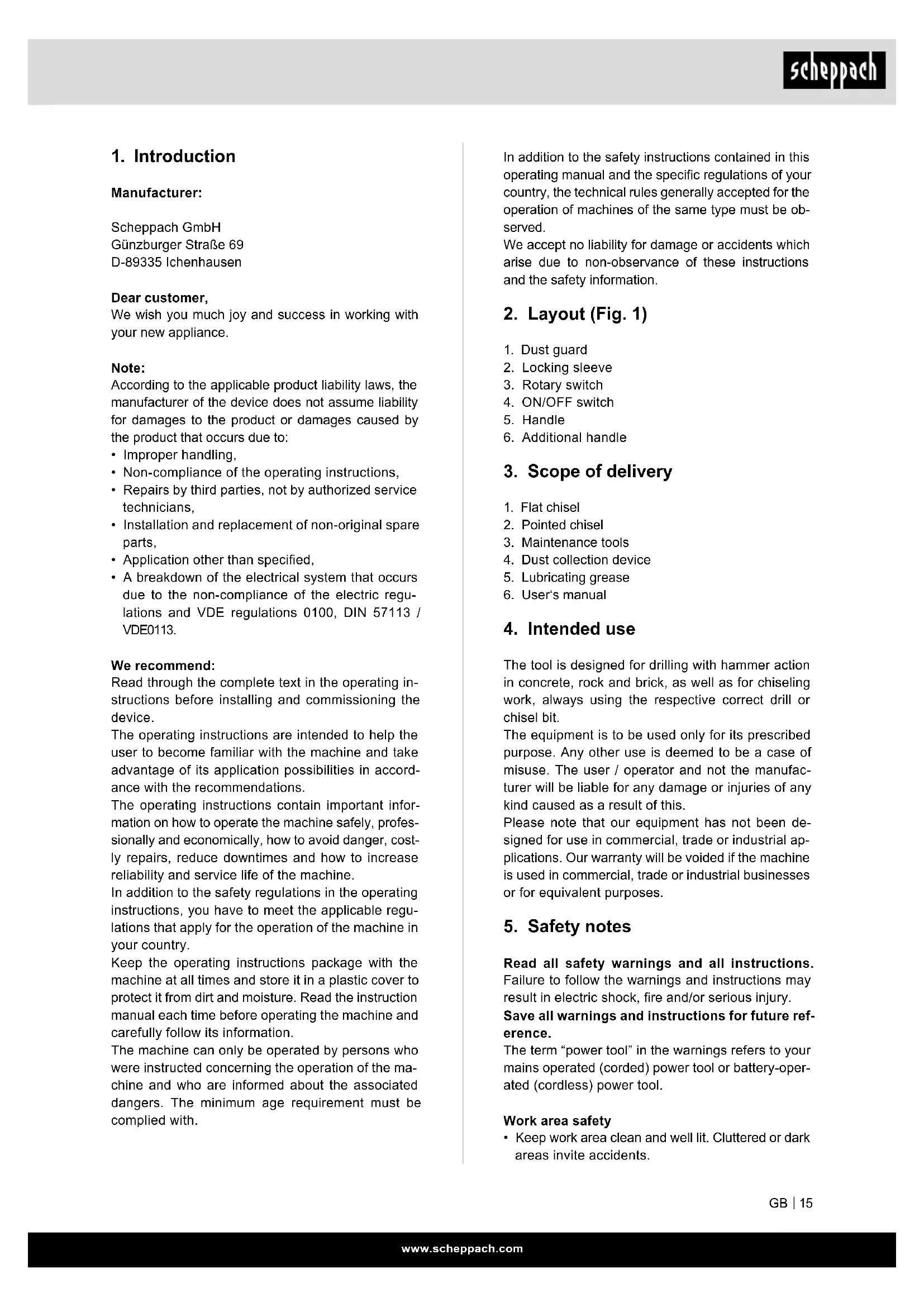 Manufacturer: Scheppach GmbH Günzburger Straße 69 D-89335 Ichenhausen Dear customer, We wish you much joy and success in working with your new appliance. Note: According to the applicable product liability laws, the manufacturer of the device does not assume liability for damages to the product or damages caused by the product that occurs due to: