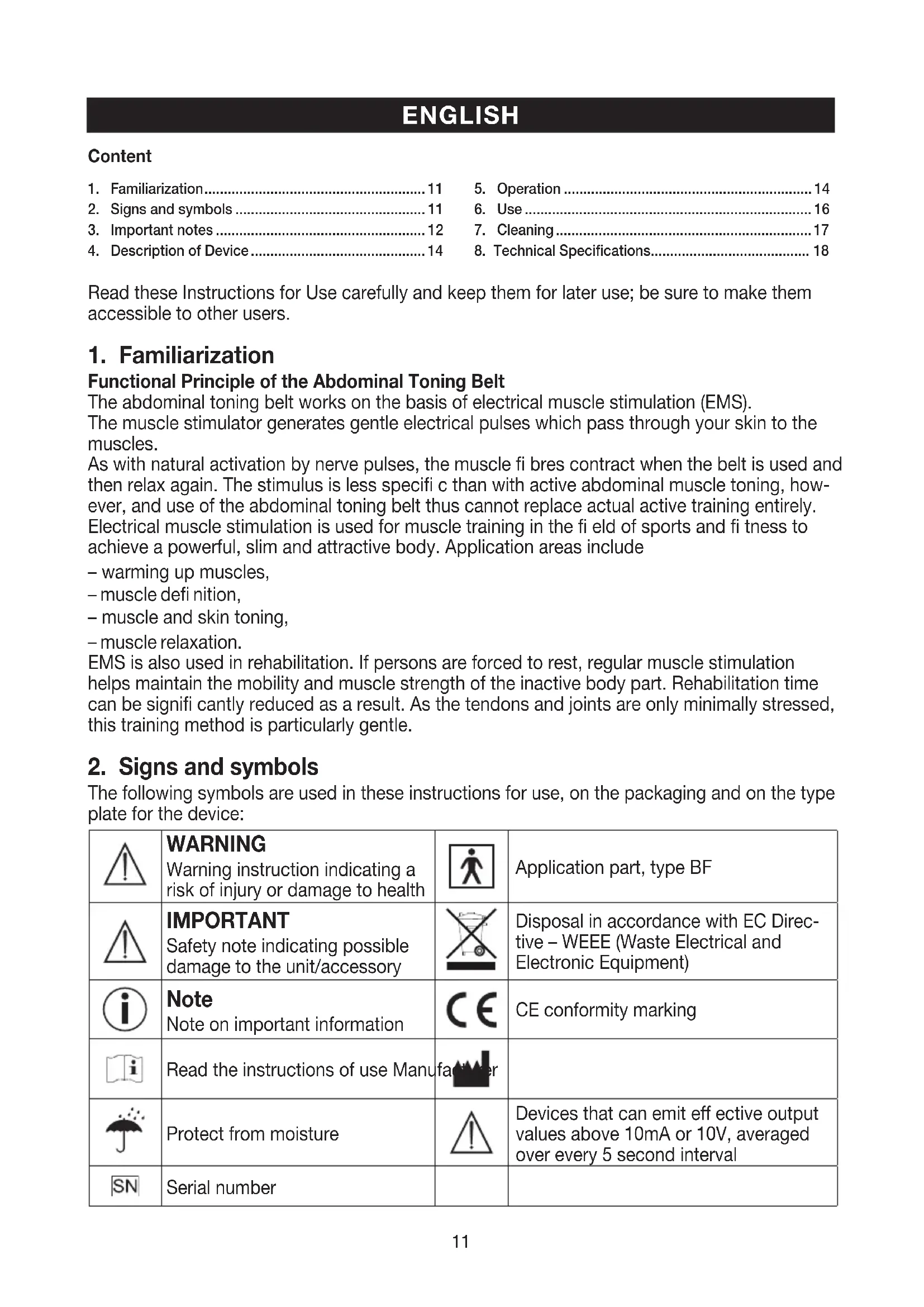 The following symbols are used in these instructions for use, on the packaging and on the type plate for the device: WARNING Warning instruction indicating a risk of injury or damage to health Application part, type BF IMPORTANT Safety note indicating possible damage to the unit/accessory Disposal in accordance with EC Direc- tive – WEEE (Waste Electrical and Electronic Equipment) Note Note on important information CE conformity marking Read the instructions of use Manufacturer Protect from moisture Devices that can emit e ective output values above 10mA or 10V, averaged over every 5 second interval Serial number ENGLISH