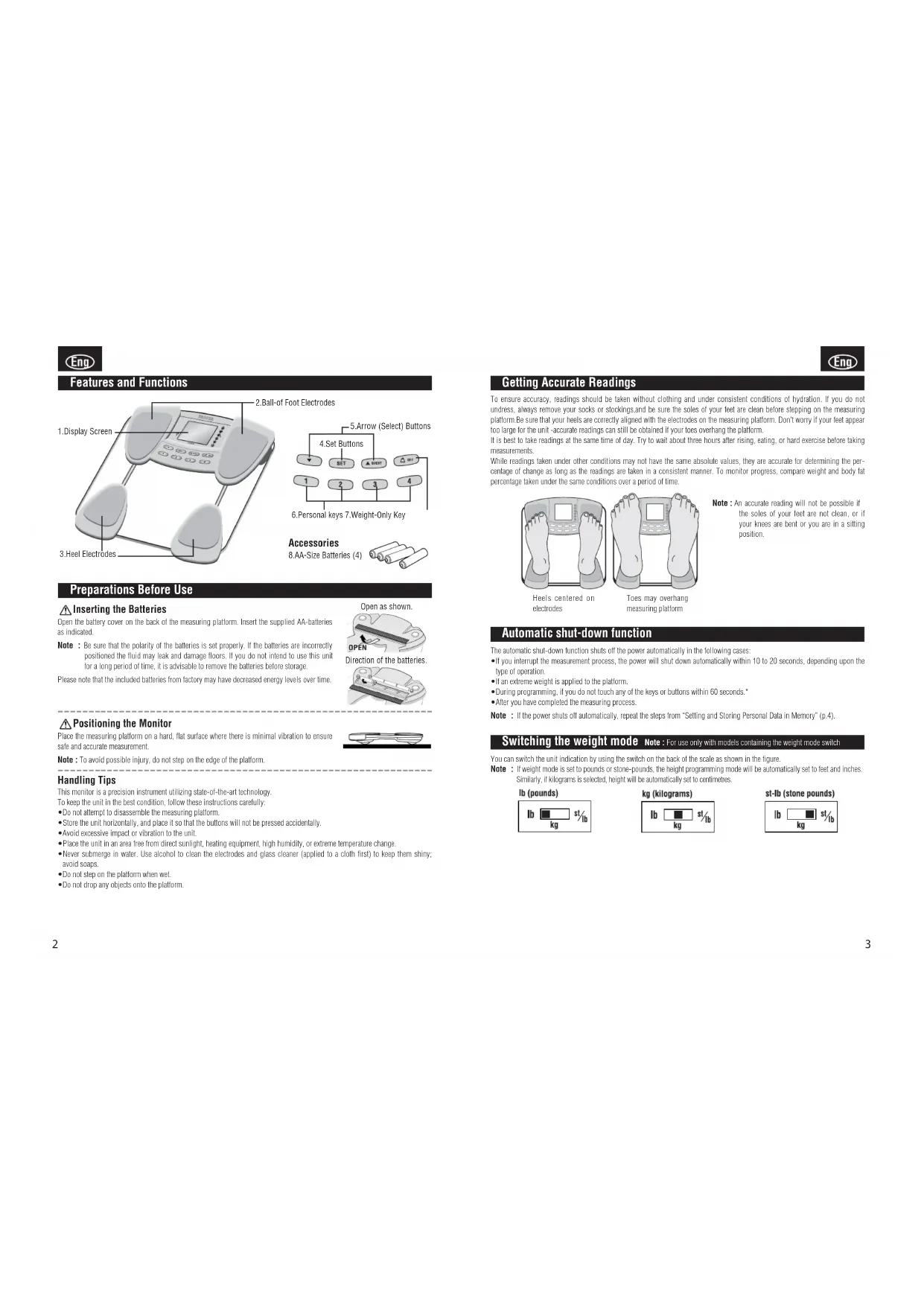 - Do not drop any objects onto the platform. Preparations Before Use Inserting the Batteries Open the battery cover on the back of the measuring platform. Insert the supplied AA-batteries as indicated. Note : Be sure that the polarity of the batteries is set properly. If the batteries are incorrectly positioned the fluid may leak and damage floors. If you do not intend to use this unit for a long period of time, it is advisable to remove the batteries before storage. Please note that the included batteries from factory may have decreased energy levels over time. Features and Functions 6.Personal keys 7.Weight-Only Key 5.Arrow (Select) Buttons Accessories 8.AA-Size Batteries (4) 1.Display Screen 2.Ball-of Foot Electrodes 3.Heel Electrodes 4.Set Buttons Open as shown. Direction of the batteries.54 Operation with Bluetooth (Using Personal key)