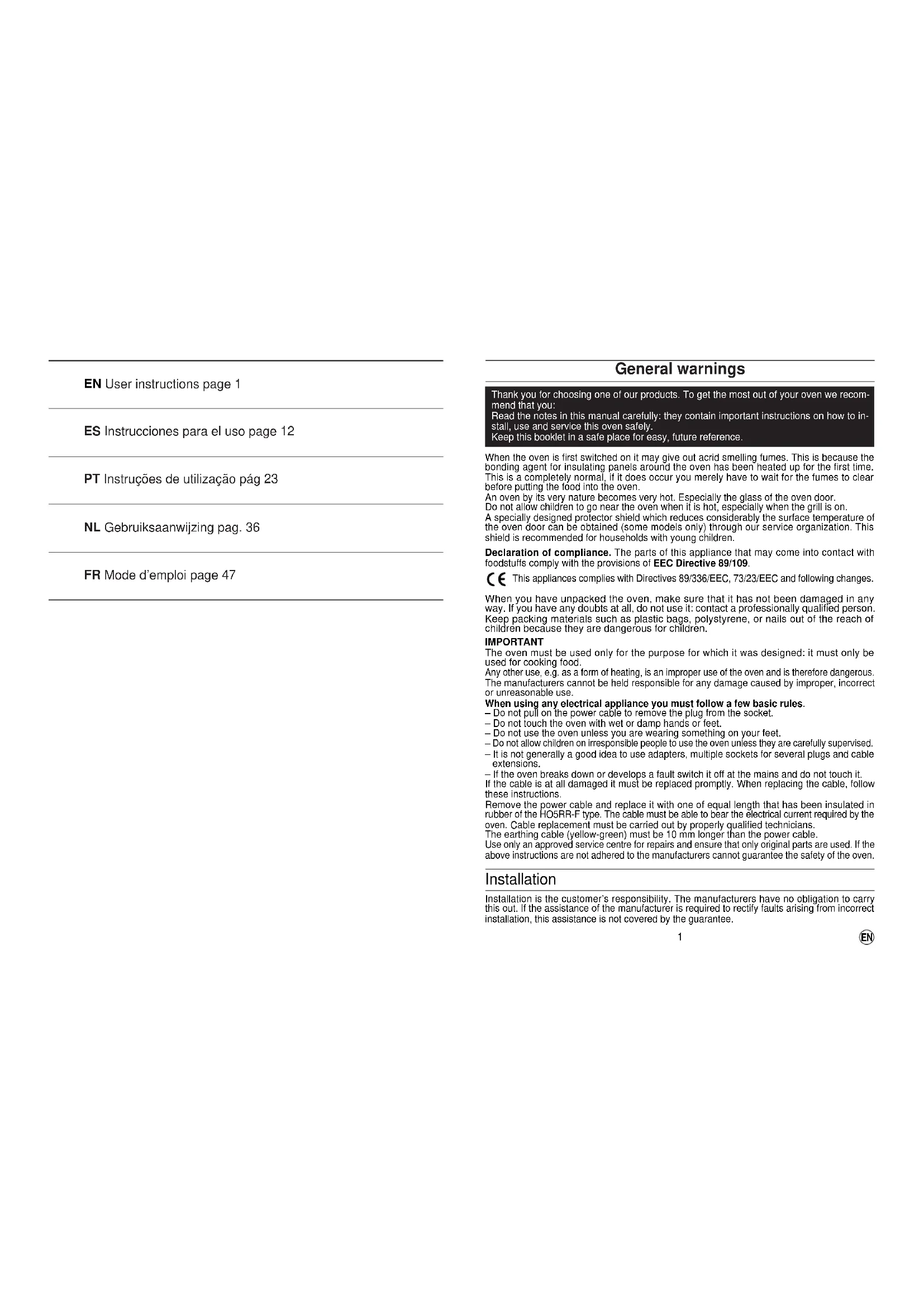 FREN User instructions page 1 ES Instrucciones para el uso page 12 PT Instruções de utilização pág 23 NL Gebruiksaanwijzing pag. 36 FR Mode d’emploi page 47 General warnings Thank you for choosing one of our products. To get the most out of your oven we recom- mend that you: Read the notes in this manual carefully: they contain important instructions on how to in- stall, use and service this oven safely. Keep this booklet in a safe place for easy, future reference. When the oven is first switched on it may give out acrid smelling fumes. This is because the bonding agent for insulating panels around the oven has been heated up for the first time. This is a completely normal, if it does occur you merely have to wait for the fumes to clear before putting the food into the oven. An oven by its very nature becomes very hot. Especially the glass of the oven door. Do not allow children to go near the oven when it is hot, especially when the grill is on. A specially designed protector shield which reduces considerably the surface temperature of the oven door can be obtained (some models only) through our service organization. This shield is recommended for households with young children. Declaration of compliance. The parts of this appliance that may come into contact with foodstuffs comply with the provisions of EEC Directive 89/109. This appliances complies with Directives 89/336/EEC, 73/23/EEC and following changes. When you have unpacked the oven, make sure that it has not been damaged in any way. If you have any doubts at all, do not use it: contact a professionally qualified person. Keep packing materials such as plastic bags, polystyrene, or nails out of the reach of children because they are dangerous for children. IMPORTANT The oven must be used only for the purpose for which it was designed: it must only be used for cooking food. Any other use, e.g. as a form of heating, is an improper use of the oven and is therefore dangerous. The manufacturers cannot be held responsible for any damage caused by improper, incorrect or unreasonable use. When using any electrical appliance you must follow a few basic rules. – Do not pull on the power cable to remove the plug from the socket. – Do not touch the oven with wet or damp hands or feet. – Do not use the oven unless you are wearing something on your feet.