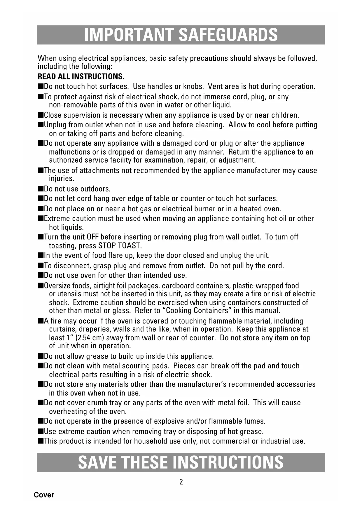 Household Products Limitedde México S. de R.L. de C.V.1500W 120V~ 60 HzWhen using electrical appliances, basic safety precautions should always be followed, including the following: READ ALL INSTRUCTIONS. ■ Do not touch hot surfaces. Use handles or knobs. Vent area is hot during operation. ■ To protect against risk of electrical shock, do not immerse cord, plug, or any non-removable parts of this oven in water or other liquid. ■ Close supervision is necessary when any appliance is used by or near children. ■ Unplug from outlet when not in use and before cleaning. Allow to cool before putting on or taking off parts and before cleaning. ■ Do not operate any appliance with a damaged cord or plug or after the appliance malfunctions or is dropped or damaged in any manner. Return the appliance to an authorized service facility for examination, repair, or adjustment. ■ The use of attachments not recommended by the appliance manufacturer may cause injuries. ■ Do not use outdoors. ■ Do not let cord hang over edge of table or counter or touch hot surfaces. ■ Do not place on or near a hot gas or electrical burner or in a heated oven. ■ Extreme caution must be used when moving an appliance containing hot oil or other hot liquids. ■ Turn the unit OFF before inserting or removing plug from wall outlet. To turn off toasting, press STOP TOAST. ■ In the event of food flare up, keep the door closed and unplug the unit. ■ To disconnect, grasp plug and remove from outlet. Do not pull by the cord. ■ Do not use oven for other than intended use. ■ Oversize foods, airtight foil packages, cardboard containers, plastic-wrapped food or utensils must not be inserted in this unit, as they may create a fire or risk of electric shock. Extreme caution should be exercised when using containers constructed of other than metal or glass. Refer to “Cooking Containers” in this manual. ■ A fire may occur if the oven is covered or touching flammable material, including curtains, draperies, walls and the like, when in operation. Keep this appliance at least 1” (2.54 cm) away from wall or rear of counter. Do not store any item on top of unit when in operation. ■ Do not allow grease to build up inside this appliance. ■ Do not clean with metal scouring pads. Pieces can break off the pad and touch electrical parts resulting in a risk of electric shock. ■ Do not store any materials other than the manufacturer’s recommended accessories in this oven when not in use. ■ Do not cover crumb tray or any parts of the oven with metal foil. This will cause overheating of the oven. ■ Do not operate in the presence of explosive and/or flammable fumes. ■ Use extreme caution when removing tray or disposing of hot grease. ■ This product is intended for household use only, not commercial or industrial use.