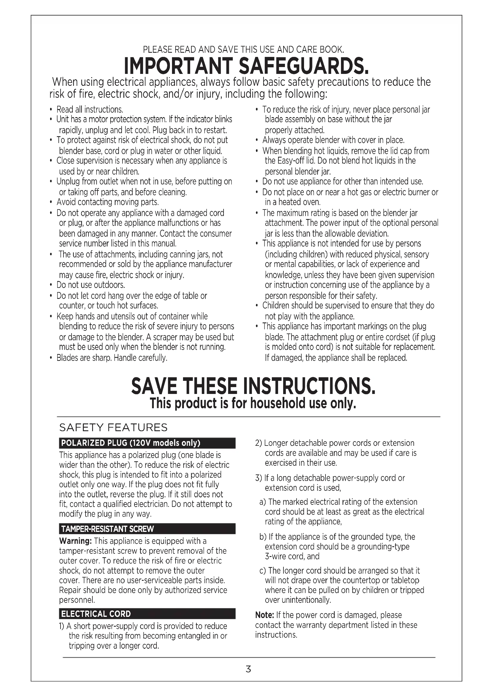 - This appliance has important markings on the plug blade. The attachment plug or entire cordset (if plug is molded onto cord) is not suitable for replacement. If damaged, the appliance shall be replaced. PLEASE READ AND SAVE THIS USE AND CARE BOOK. IMPORTANT SAFEGUARDS. When using electrical appliances, always follow basic safety precautions to reduce the risk of fire, electric shock, and/or injury, including the following: SAVE THESE INSTRUCTIONS. This product is for household use only. POLARIZED PLUG (120V models only)This appliance has a polarized plug (one blade is wider than the other). To reduce the risk of electric shock, this plug is intended to fit into a polarized outlet only one way. If the plug does not fit fully into the outlet, reverse the plug. If it still does not fit, contact a qualified electrician. Do not attempt to modify the plug in any way.TAMPER-RESISTANT SCREWWarning: This appliance is equipped with a tamper-resistant screw to prevent removal of the outer cover. To reduce the risk of fire or electric shock, do not attempt to remove the outer cover. There are no user-serviceable parts inside. Repair should be done only by authorized service personnel. ELECTRICAL CORD1) A short power-supply cord is provided to reduce the risk resulting from becoming entangled in or tripping over a longer cord.2) Longer detachable power cords or extension cords are available and may be used if care is exercised in their use.3) If a long detachable power-supply cord or extension cord is used, a) The marked electrical rating of the extension cord should be at least as great as the electrical rating of the appliance, b) If the appliance is of the grounded type, the extension cord should be a grounding-type 3-wire cord, and c) The longer cord should be arranged so that it will not drape over the countertop or tabletop where it can be pulled on by children or tripped over unintentionally.Note: If the power cord is damaged, please contact the warranty department listed in these instructions. SAFETY FEATURES4