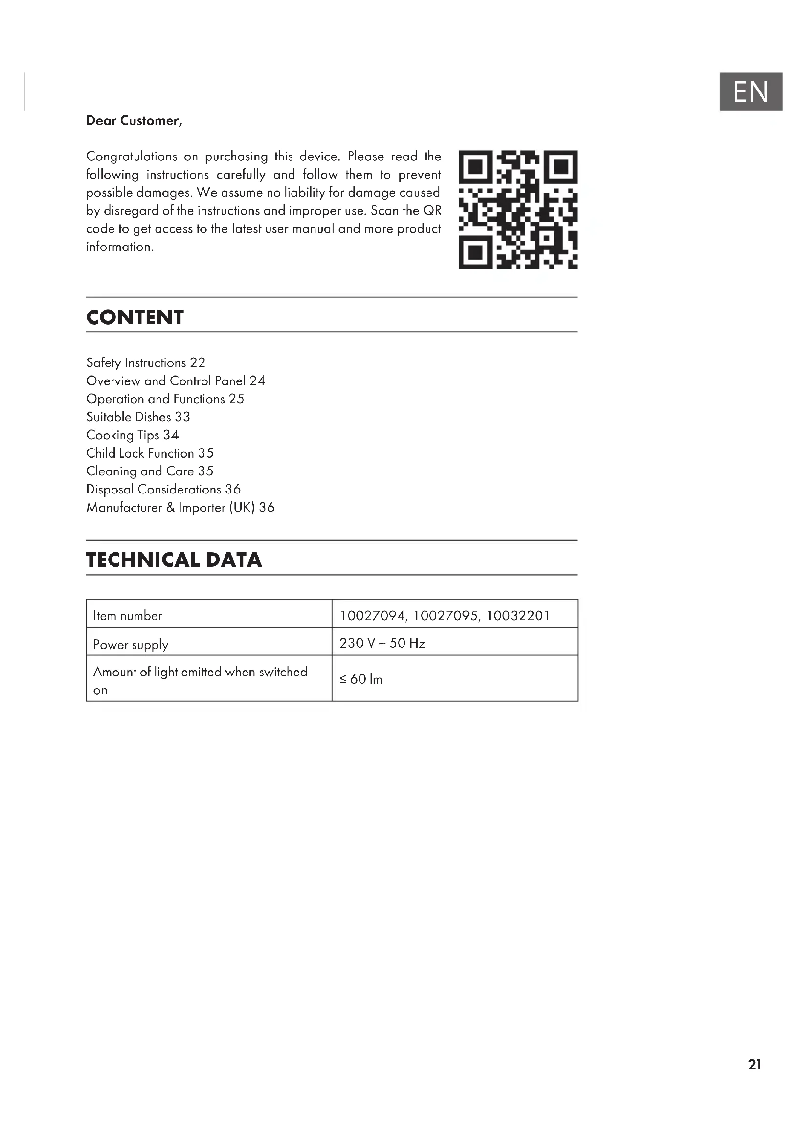 Dear Customer, Congratulations on purchasing this device. Please read the following instructions carefully and follow them to prevent possible damages. We assume no liability for damage caused by disregard of the instructions and improper use. Scan the QR code to get access to the latest user manual and more product information. CONTENT Safety Instructions22 Overview and Control Panel24 Operation and Functions25 Suitable Dishes33 Cooking Tips34 Child Lock Function35 Cleaning and Care35 Disposal Considerations36 Manufacturer & Importer (UK)36 TECHNICAL DATA Item number 10027094, 10027095, 10032201 Power supply 230 V ~ 50 Hz Amount of light emitted when switched