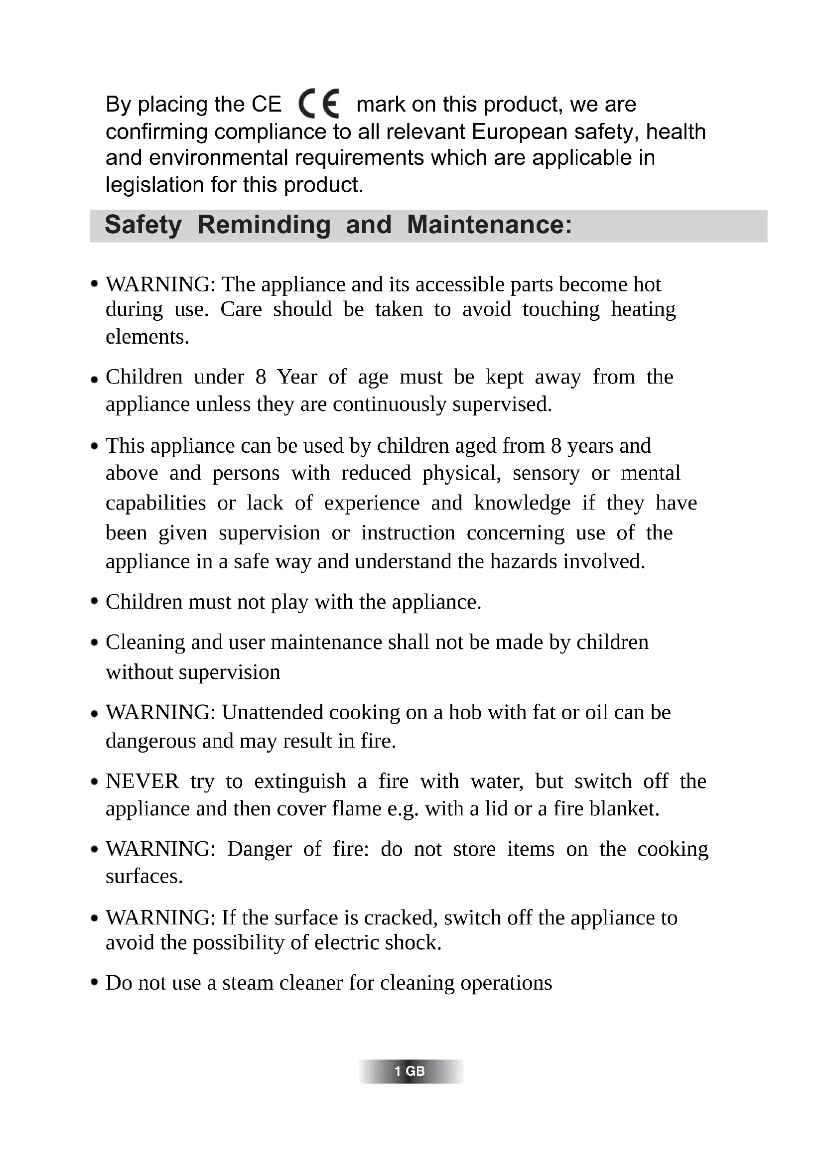 Cancelling the "BOOST" mode 1.Press the " " key, all the indicators show "--". Press the“ " key, the power level indicator showing " " 6 GB iekdZ edY[WdZ Wbb j^[ _dZ_YWjehi m_bb Yec[ ed\eh ed[ i[YedZ WdZ j^[d]e ekj3 R^[ ^eX _i dem_d ijWdZXo ceZ[3ObWY[ j^[ fWd _d j^[ Y[djh[ e\ j^[ Yeea_d] ped[3Select the power level by pressing the "+" or "-" key for the relevant hotplate. To begin with the indicator shows" "or " " by pressing the "+" or "-" key. Adjust up or down by pressing the "+" or "-" key.If you press the "+" and "-" keys simultaneously, the power setting returns to" "and the cooking zone switches off.NB : When the " " key is pressed, the induction hob returns to standby mode if no other operation is carried out within 1 minute.1. The boost function only operates for 5 minutes, after which the cooking zone will revert to its original setting. 3. As the boost function of the 1st cooking zone is activated, the 2nd cooking zone is limited under level 2 automatically,vice versa. As the boost function of the 3rd cooking zone is activated,the 4th cooking zone is limited under level 2 automatically, vice versa. Cancel the "Boost" mode by pressing the "+" or "-" key of the corresponding zone. If more than 1 zone is switched on : Press the "+" key once increases the time by one minute ; hold down the "+" key increases the time by 10 minutes ;Press the "-" key once decreases the time by one minute ;hold down the "-" key decreases the time by 10 minutes ; If the timer is set on more than 1 zone: Timer function Note: 1. When the timer is 0 minute, the timer is cancelled.You can set the power level during the timer mode. then press the " + " or " - " timer key power activate the selected zone by pushing "+" or "-" key of that zone,the corresponding digits will be flashing.level indicator flashing and showing " " and the timer indicator flashesTo begin with the indicator shows" ",set the time by pressing the "+" or "-" key. After setting the time, you can select the power level of the cooking zone.Then set the time for between 1 minute and 9 hours 59 minutes by pressing the "+" or "-" key.When the time exceeds 1 hour, hold down the "+" key increases the time by 30 minutes .When the time exceeds 2 hours, hold down the "-" key decreases the time by 30 minutes .Timer can be set on all 4 cooking zones. When you set the time for several cooking zones simultaneously, decimal dots of the relevant cooking zones are on.on the timer display will be shown the timer than will expire first. The dot of the corresponding zone will be on but flashing.Once the countdown timer expires the corresponding zone will be switch off. Then it will be shown the new first expiring timer and the corresponding zone will have the dot flashing.If the timer is set but not active on any zone, it will work simply as timer countdown. 2. When time elapses, the relevant cooking zone is switched off. 3. After setting the timer, the timing indicator has been flashing for 5 seconds, the set time will be automatically confirmed.E`efdgUf[a`e Xad NeW 7 GB 4. In timer mode, pressing the "+" or "-" key of the timer simultaneously, timer setting returns to"0", time is cancelled. Safety mode Special function SIMMERING keyMEDIUM keyHIGH key (level 1) (level 8) (level 15) Ativate the selected zone by pushing "+" or "-". Unlock: Lock: To ensure the safety of children, the induction hob is fitted with an interlock device.In working mode, press the " " key, the hob then goes into the lock mode, timer will display " " and the rest of the keys are disabled except the " " key.In standby mode, press the "lock" key, the hob then goes into the lock mode, the timer shows" " and the rest of the keys are disabled.The timer shows" " for a while and then goes out.If you press the key, " " will be displayed for a while. Hold down the"Lock" key for 3 second, and the lock function will be deactivate. Memory function Recording " ", recording is started. Stop recording You can use the memory function to store the power level settings and duration for one zone.Select the desired cooking zone by pressing the "+" or "-" key, with the power level indicator of that zone flashing, press the" " key, with the timer indictor showing " ", " "means "no cooking cycle in memory". hold down the memory key for 3 seconds, with the timer indicator show The maximum number of operations is 10 power level variations in 8 hours. Any power level variation lasting less than 15 seconds will not be recorded.Press again the memory key, " " will be no more display on the timer display and the cooking cycle will be storedthe power level indicator showing " " and power level alternately. press the SIMMERING key, the indicator will be show “ ” press the MEDIUM key, the indicator will be show “ ” Keep warm mode press the HIGH key, the indicator will be show “ ” This function will allow to keep the food warm for up to 2 hours. Activate the selected zone by pushing the "-" or "+" button Press the "-" till when you reach the level between 0 and 1, you will see the keep warm level. " "will appear under the area selected. To exit for the keep warm function, set any other power level Cancelling the Keep warm modeE`efdgUf[a`e Xad NeW