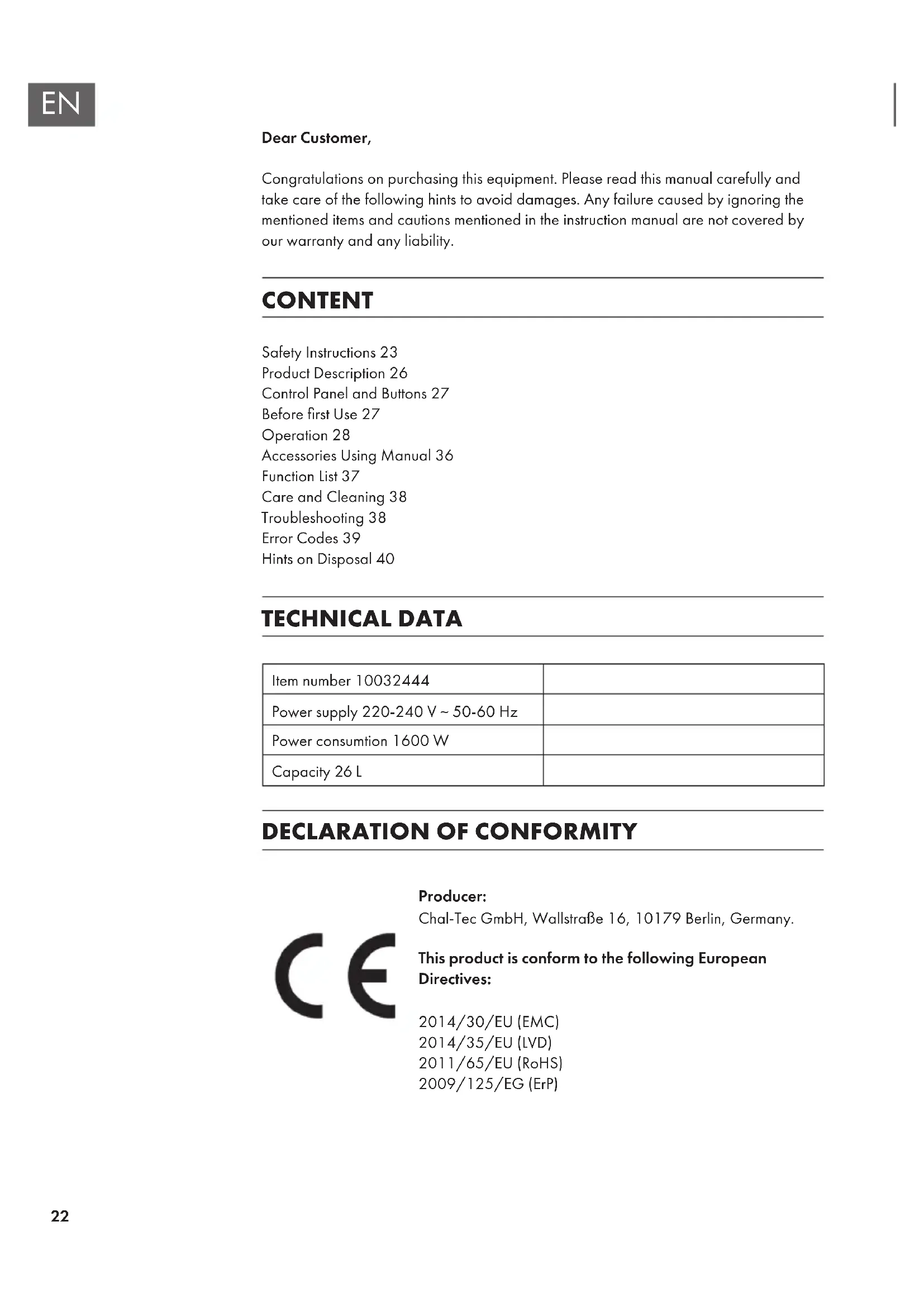 Dear Customer, Congratulations on purchasing this equipment. Please read this manual carefully and take care of the following hints to avoid damages. Any failure caused by ignoring the mentioned items and cautions mentioned in the instruction manual are not covered by our warranty and any liability. CONTENT Safety Instructions23 Product Description26 Control Panel and Buttons27 Before rst Use27 Operation28 Accessories Using Manual36 Function List37 Care and Cleaning38 Troubleshooting38 Error Codes39 Hints on Disposal40 TECHNICAL DATA Item number 10032444 Power supply 220-240 V ~ 50-60 Hz Power consumtion 1600 W Capacity 26 L