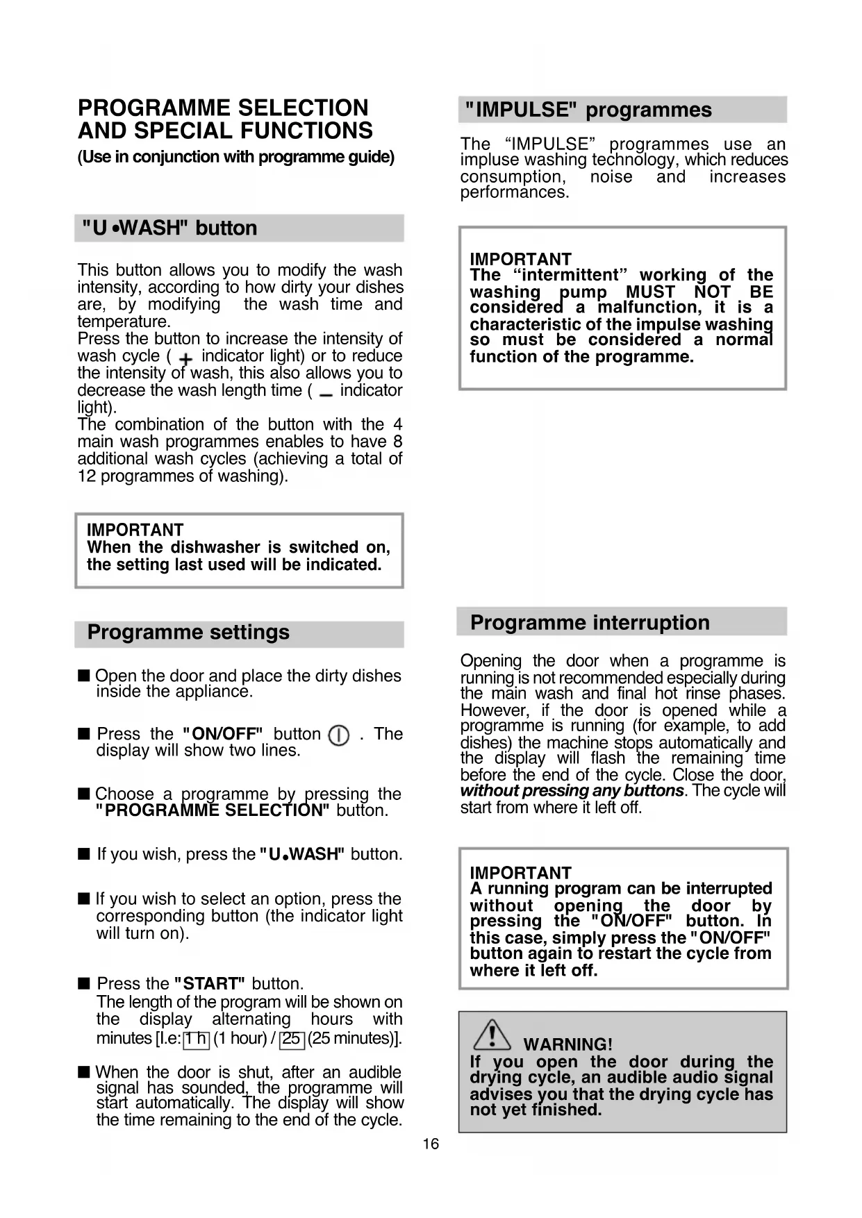 (Use in conjunction with programme guide) "U WASH" button This button allows you to modify the wash intensity, according to how dirty your dishes are, by modifying the wash time and temperature. Press the button to increase the intensity of wash cycle ( indicator light) or to reduce the intensity of wash, this also allows you to decrease the wash length time ( indicator light). The combination of the button with the 4 main wash programmes enables to have 8 additional wash cycles (achieving a total of 12 programmes of washing). IMPORTANT When the dishwasher is switched on, the setting last used will be indicated. Programme settings ■ Open the door and place the dirty dishes inside the appliance. ■ Press the "ON/OFF" button . The display will show two lines. ■ Choose a programme by pressing the "PROGRAMME SELECTION" button. ■ If you wish, press the "U WASH" button. ■ If you wish to select an option, press the corresponding button (the indicator light will turn on). ■ Press the "START" button. The length of the program will be shown on the display alternating hours with minutes [I.e: 1 h (1 hour) / 25 (25 minutes)]. ■ When the door is shut, after an audible signal has sounded, the programme will start automatically. The display will show the time remaining to the end of the cycle. "IMPULSE" programmes The “IMPULSE” programmes use an impluse washing technology, which reduces consumption, noise and increases performances. IMPORTANT The “intermittent” working of the washing pump MUST NOT BE considered a malfunction, it is a characteristic of the impulse washing so must be considered a normal function of the programme. Programme interruption Opening the door when a programme is running is not recommended especially during the main wash and final hot rinse phases. However, if the door is opened while a programme is running (for example, to add dishes) the machine stops automatically and the display will flash the remaining time before the end of the cycle. Close the door, without pressing any buttons. The cycle will start from where it left off. IMPORTANT A running program can be interrupted without opening the door by pressing the "ON/OFF" button. In this case, simply press the "ON/OFF" button again to restart the cycle from where it left off. WARNING! If you open the door during the drying cycle, an audible audio signal advises you that the drying cycle has not yet finished.