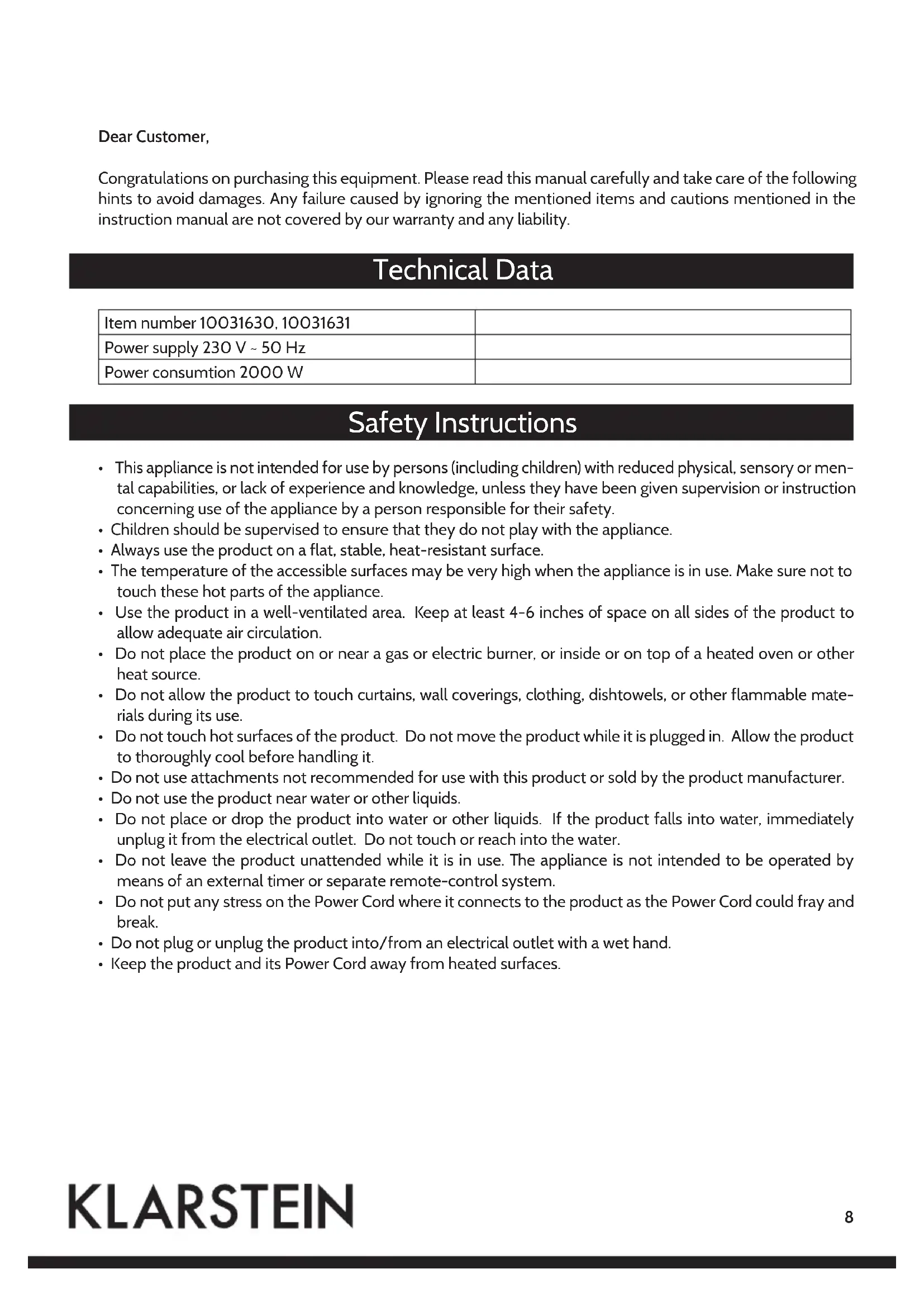 Download the instructions for your Electric grill in PDF format for free! Find your manual 10031630 - Klarstein and take your electronic device back in hand. On this page are published all the documents necessary for the use of your device. 10031630 by Klarstein.
