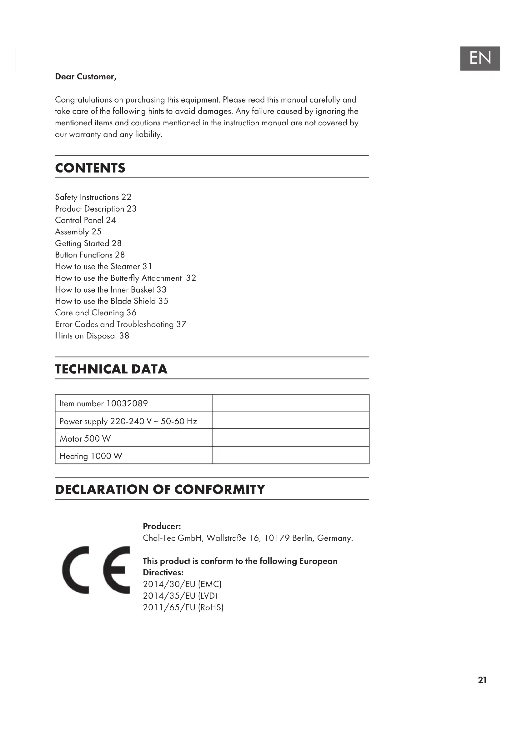Dear Customer, Congratulations on purchasing this equipment. Please read this manual carefully and take care of the following hints to avoid damages. Any failure caused by ignoring the mentioned items and cautions mentioned in the instruction manual are not covered by our warranty and any liability. CONTENTS Safety Instructions22 Product Description23 Control Panel24 Assembly25 Getting Started28 Button Functions28 How to use the Steamer31 How to use the Buttery Attachment 32 How to use the Inner Basket33 How to use the Blade Shield35 Care and Cleaning36 Error Codes and Troubleshooting37 Hints on Disposal38 TECHNICAL DATA Item number 10032089 Power supply 220-240 V ~ 50-60 Hz Motor 500 W Heating 1000 W