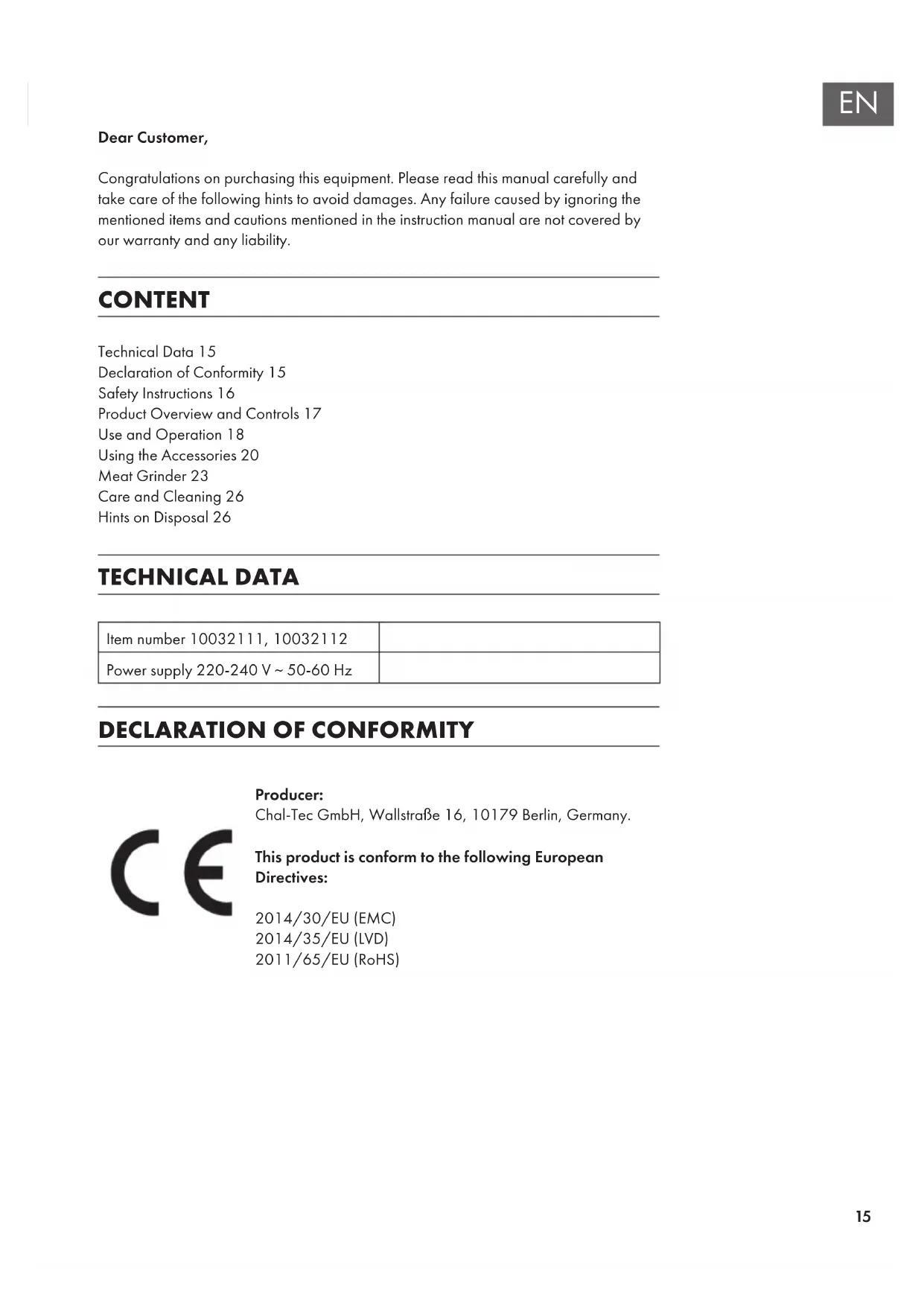 Dear Customer, Congratulations on purchasing this equipment. Please read this manual carefully and take care of the following hints to avoid damages. Any failure caused by ignoring the mentioned items and cautions mentioned in the instruction manual are not covered by our warranty and any liability. CONTENT Technical Data15 Declaration of Conformity15 Safety Instructions16 Product Overview and Controls17 Use and Operation18 Using the Accessories20 Meat Grinder23 Care and Cleaning26 Hints on Disposal26 TECHNICAL DATA Item number 10032111, 10032112 Power supply 220-240 V ~ 50-60 Hz