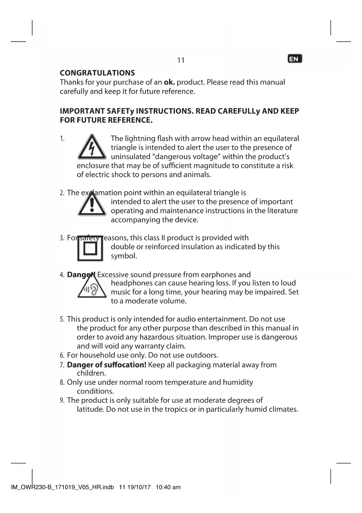 Radio Input voltage : 5 V 0.55 A Operation power consumption : 2.5 W Battery operation : 2 x 1.5 V (Type LR03/AAA, not included) Frequency range : 87.5 – 108 MHz (FM) 522 – 1620 KHz (AM) DISPOSAL Do not dispose of this product as unsorted municipal waste. Return it to a designated collection point for the recycling of WEEE. By doing so, you will help to conserve resources and protect the environment. Contact your retailer or local authorities for more information. Please dispose of batteries in an environmentally friendly manner. Do not put batteries into the household waste. Please use the return and collection systems in your community or contact the dealer where you purchased the product. IM_OWR230-B_171019_V05_HR.indb 18 19/10/17 10:40 am19