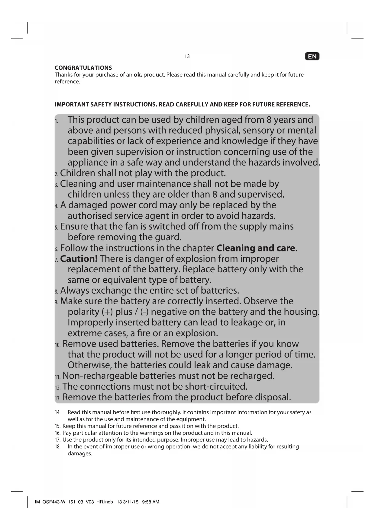 CONGRATULATIONS Thanks for your purchase of an ok. product. Please read this manual carefully and keep it for future reference. IMPORTANT SAFETY INSTRUCTIONS. READ CAREFULLY AND KEEP FOR FUTURE REFERENCE.