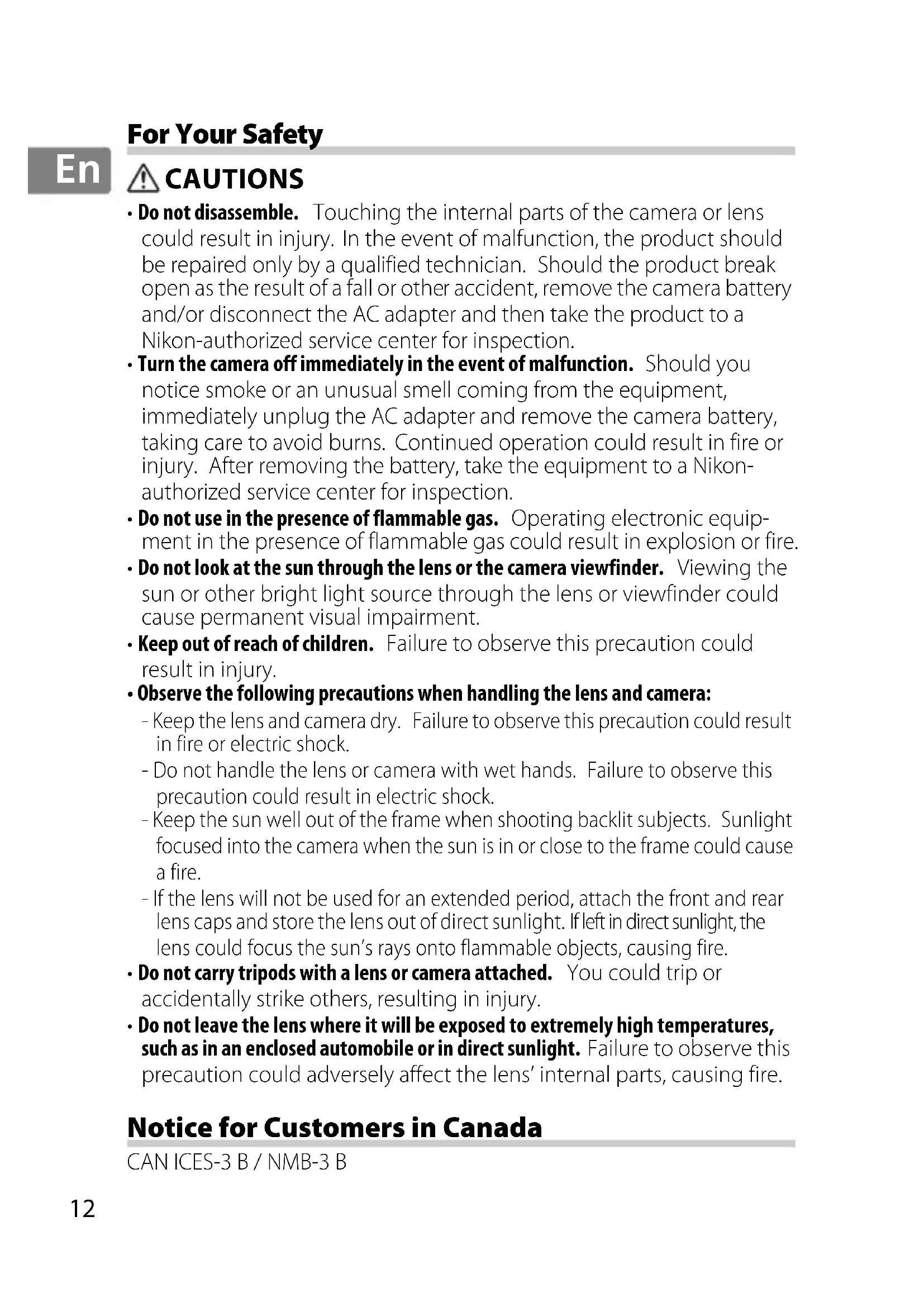 - Do not disassemble. Touching the internal parts of the camera or lens could result in injury. In the event of malfunction, the product should be repaired only by a qualified technician. Should the product break open as the result of a fall or other accident, remove the camera battery and/or disconnect the AC adapter and then take the product to a Nikon-authorized service center for inspection.