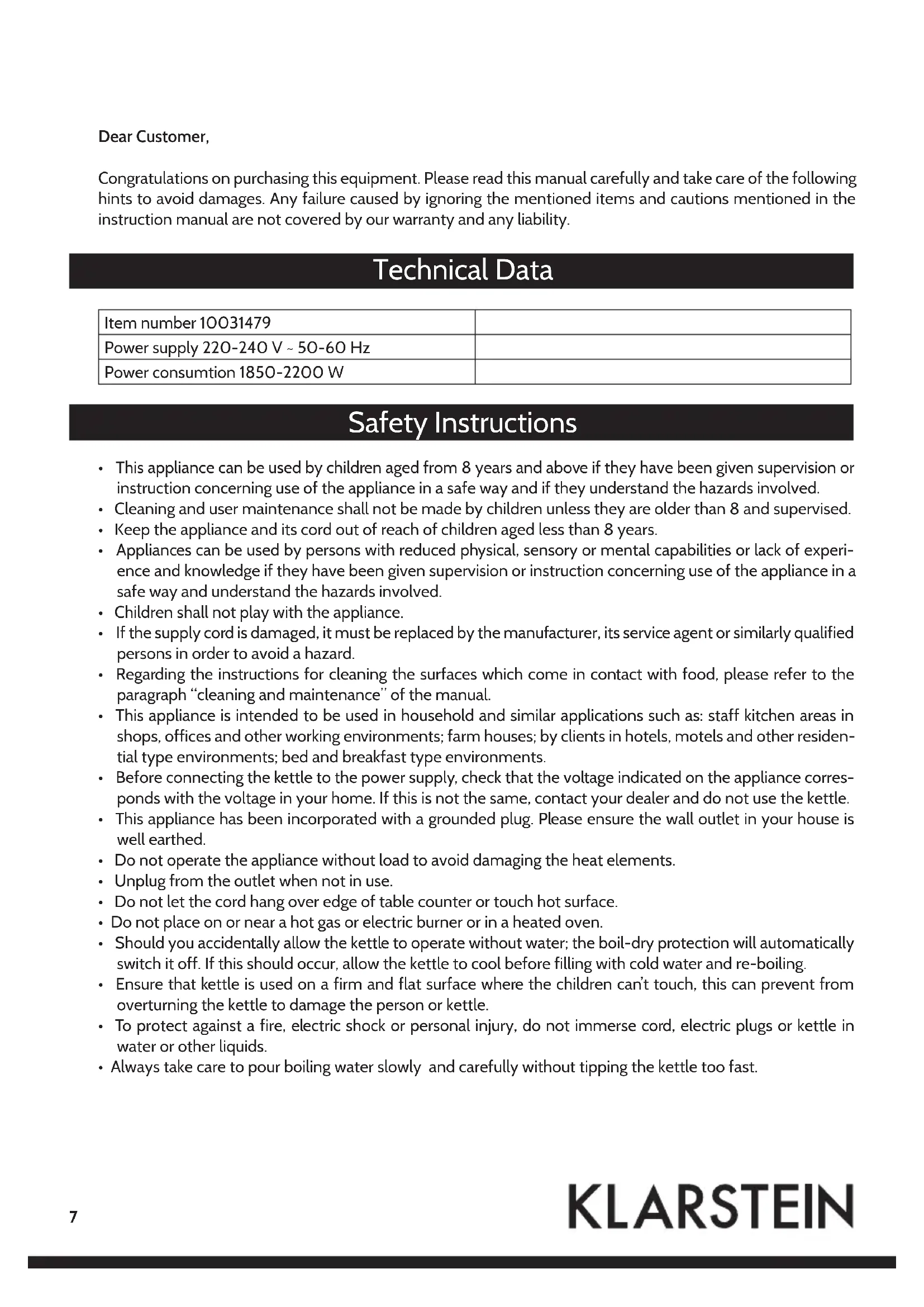 Download the instructions for your Kettle in PDF format for free! Find your manual 10031479 - Klarstein and take your electronic device back in hand. On this page are published all the documents necessary for the use of your device. 10031479 by Klarstein.