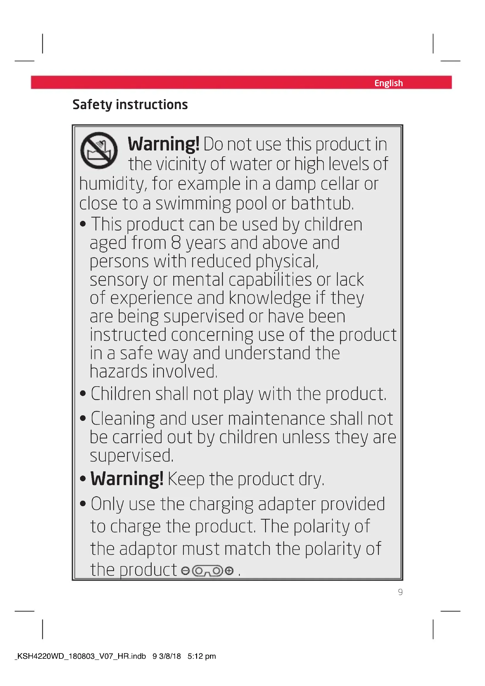 - Überprüfen des Ladekabels IM_KSH4220WD_180803_V07_HR.indb 8 3/8/18 5:12 pm9 English Safety instructions Warning! Do not use this product in the vicinity of water or high levels of humidity, for example in a damp cellar or close to a swimming pool or bathtub.
