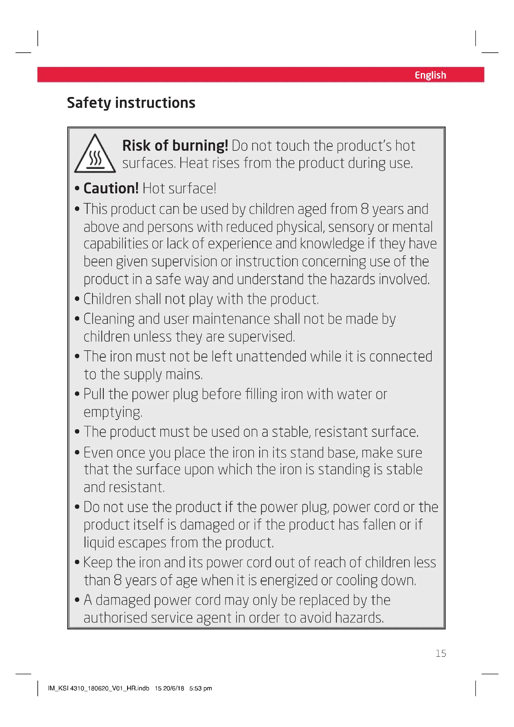 - A damaged power cord may only be replaced by the authorised service agent in order to avoid hazards. IM_KSI 4310_180620_V01_HR.indb 15 20/6/18 5:53 pmEnglish