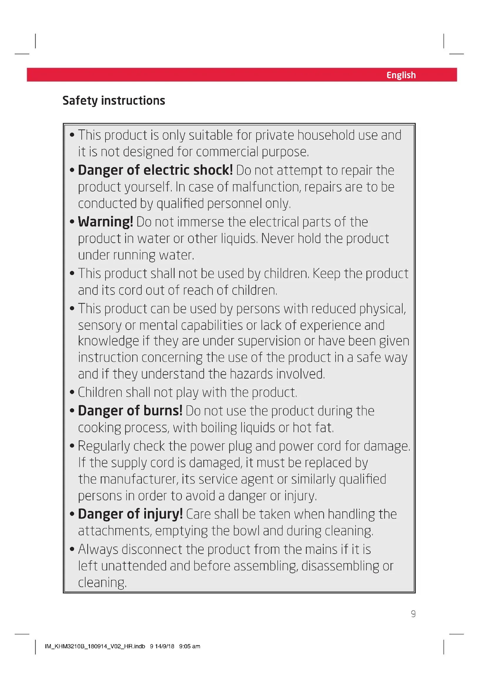 - Always disconnect the product from the mains if it is left unattended and before assembling, disassembling or cleaning. IM_KHM3210B_180914_V02_HR.indb 9 14/9/18 9:05 am10 English Size - A5 Safety instructions