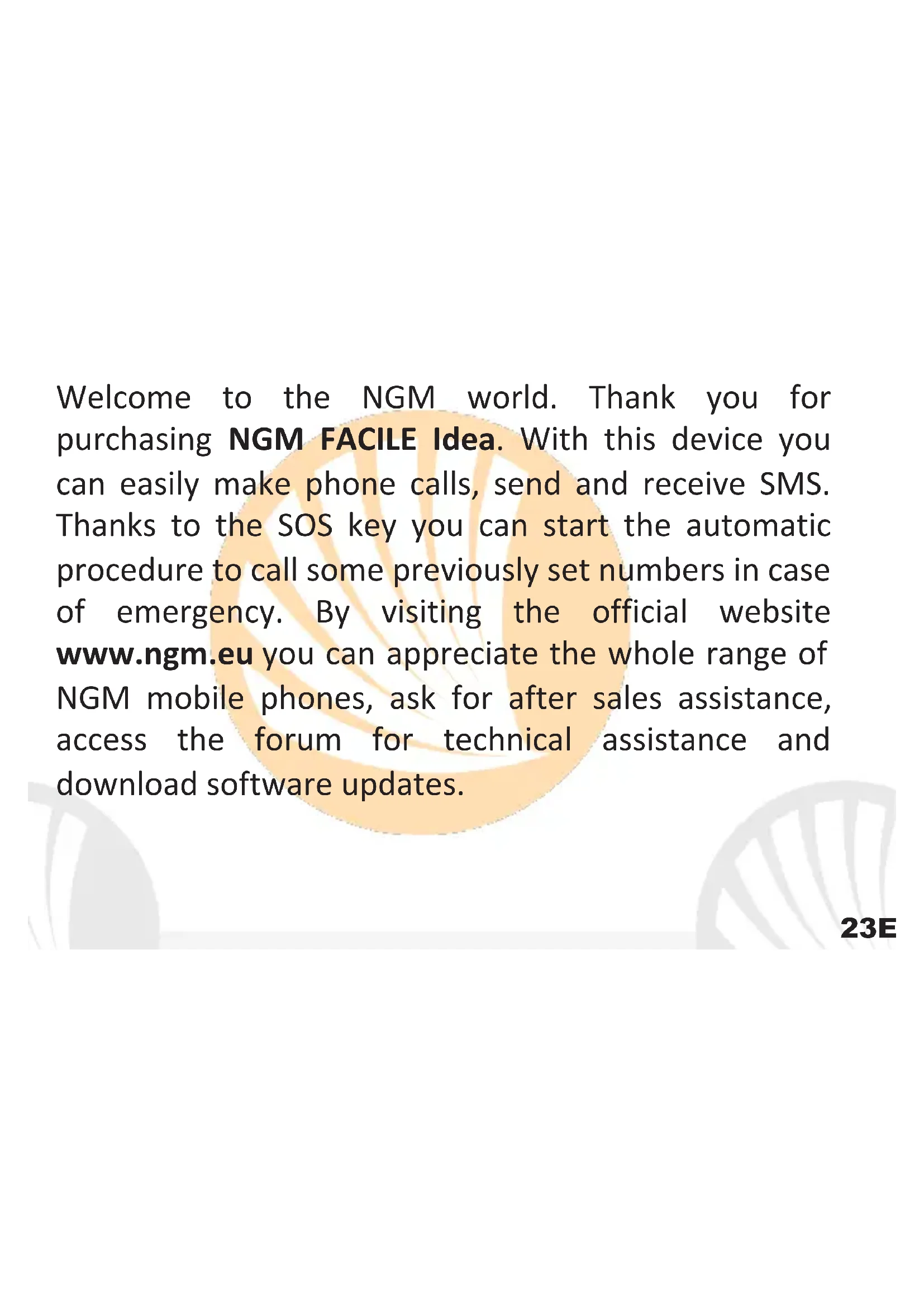 Home Screen32 ENGLISH Making a call: to make a call from the Home screen, select the desired number using the keypad and then press the green call key. To end the call, press the red end call key. Call a number from phonebook: from the main screen, press the upper right selection key; this will automatically open the Phonebook. Scroll through the contacts with the UP and DOWN keys and press the green call button to call the desired contact. Call a number from the call log: from the main screen, press the green call key; the missed, received, and outgoing calls will be automatically displayed. Scroll them with UP and DOWN keys and press the green call button when you found the number you want to call.33ENGLISH Add contacts to the Phonebook Select Menu > Phonebook > Add new contact, choosing to save the number on SIM or Phone. Enter the name and the new number, then press Options > Save. Speed dial: in Menu > Phonebook > Options > Phonebook settings > Speed Dial > Set Number, you can assign to keys 2-9 some numbers that will be called automatically if you hold down the related button. This feature can be turned on and off under Status. The device has two other additional quick dial keys M1 and M2, to which you could associate as much numbers in the same menu. These keys, placed to the left and to the right of OK button, will be activated with a simple press.34 ENGLISH Memory status: this feature within the phonebook settings allows you to see how much free storage there is on the phone and SIM card. Speech Dial: NGM FACILE Idea speaks out each number key you press. To activate this function, select Menu > Profiles > General > Options > Customize > Dialpad > Speech Dial [Warning: available for Italian language only] Send and read SMS Send SMS: From the main screen, choose Menu > Messaging > Write message and write your message. Press Options > Send to > Enter Number and enter the number using the numeric keypad or Add from phonebook to select from the Phonebook the contact you want to text.35ENGLISH Read SMS: when you receive a new text message, the phone displays an envelope icon on the top bar (as long as the message is unread) and a notification pop up appears on the main screen. Press the upper left selection key to enter the Inbox or access it from the main screen by selecting Menu > Messages > Inbox. On SMS settings you could find the Memory Status, which allows you to check the number of messages on the phone and SIM card. Bluetooth: In Tools > Bluetooth > Power ON you can turn on Bluetooth and search for other devices (headsets, phones…) by selecting the Search for devices option. Select the device you would like to associate with and confirm it on both devices.36 ENGLISH S.O.S. Function: NGM FACILE Idea is equipped with a dedicated button for fast forwarding emergency calls (*). This feature can be turned on and off by selecting Menu > SOS > Status. The SOS button is placed on the backside of the phone. In case of emergency, use this function to ask for help up to five phone numbers, previously set in Menu > SOS > SOS numbers. Press and hold SOS button for 2-3 seconds. As soon as the SOS function is active, the phone will send out a high volume alarm. Then, it will send a customizable SOS message to the chosen SOS numbers. After, the phone will call the five SOS numbers, for about 25 seconds each. If there is no answer, there will be a second cycle of calls. The whole procedure will be repeated for 5 times.37ENGLISH If one of the called numbers answers, the cycle will be interrupted and the call will automatically switch to speaker phone (handsfree). Attention: The SOS calls cycle will also be interrupted if the answering machine or voicemail of one of the called SOS numbers takes the call.