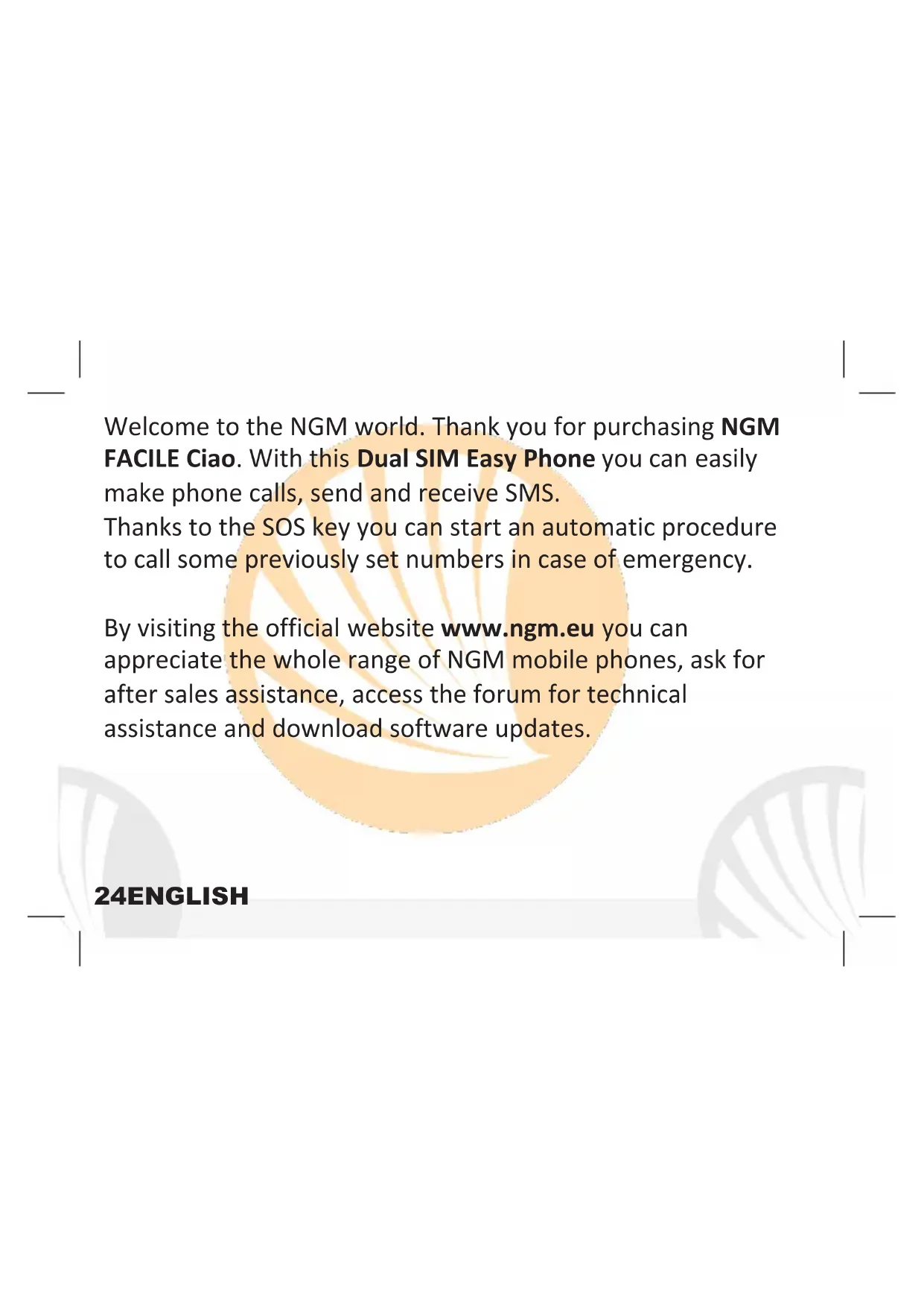 Receiver End call and Power On/Off key Vibration Key Up/Down selection keys SOS key Volume +/- and UP/DOWN selection keys Key lock Speaker LCD display Earphone Plug Speed-dial keys Right selection key Microphone Camera Eyelet for wristband Torch on/off Call key Left selection key31ENGLISH Turn ON, Turn OFF and keypad lock To turn on and turn off the phone, press and hold the red end call key . To rapidly lock and unlock the keypad, use the dedicated Lock Key on the left side of the phone . You can also choose the time lapse after which the keypad is automatically blocked in Menu > Settings > Security > Keys lock . Dual SIM: to enable or disable the SIM separately at any time, select Menu > Settings > Dual SIM.32 ENGLISH Main Menu To access the Main Menu on your phone, press the left selection key . Scroll through the items in the menu with the up and down keys . - Messaging to write and read SMS text messages - Phonebook to manage and save contacts - Calls: call settings and call log - Multimedia: camera, gallery, videocamera, video player, audio recorder, radio and file manager - Settings to personalize your phone (Profiles, Dual SIM..) - Tools with Alarm, Calendar, To Do and Calculator - SOS to enable and customize the SOS function33ENGLISH Making a call To make a call from the home screen, type the desired number with the keypad, press the green call key and then choose the the SIM you want to use with the keys; finally press OK with the left selection key . To end the call, press the red end call key . Answer an incoming call The external screen displays the caller number or the name if the contact has been saved on Phonebook. Take an incoming call simply by pressing . During the conversation, by selecting Options with , you can mute the microphone, put the call on hold, end the call, open the address book, call log or messages and record the call.34 ENGLISH Call a number from the Phonebook: from the main menu, go to Address Book or press names with from the Home screen. Scroll through the contacts with the UP and DOWN keys and press the green call key and select the desired SIM card to call a selected contact. Call a number from the call log: from the main screen, press ; the missed, received and outgoing calls will be automatically displayed. Scroll them with the keys and press again the green call key and select the desired SIM card when you found the number you want to call back. Add contacts to the Phonebook: select Menu > Phonebook > Add new > Select and choose the storage between one of the SIM cards or the Phone. Enter the name and the new number, then press Options > Save.35ENGLISH Speed Dial: in Menu > Contacts > Options > Advanced Settings > Speed dial you have access to the screen from which you can assign to keys 2-9 (set Numbers) and to keys M1-M3 (M1-M2-M3) phone numbers from your address book which will be called automatically if the key is pressed and held from the Home screen. This feature can be turned on and off under Status. Memory status: In the Phonebook > Options > Settings > Memory status you can check how many free storage locations there are on phone and on the SIM cards. Send SMS: from the main screen, choose Menu > Messaging > Write message and write your message. Press Options > Send to > Number and enter the number using the numeric keypad or Add from phonebook to select from the Phonebook the contact you want to text.36 ENGLISH Read SMS: when you receive a new SMS, a pop up notification appears in the main screen and in the external display. Press View (with the OK key) to access the Received folder or open it from the main screen by selecting Menu > Messages > Received. In the messaging menu, you can access additional features such as Templates (short preset messages) and Memory status in SMS Settings, to control how many messages there are in the phone memory and on the SIM cards. Speech: NGM FACILE Ciao can speak out each key that is pressed; select Settings > Profiles > General > Customize > Keypad > Options > Change. From the same menu, you can also choose a tone for the keypad or a click. [Warning: speech is available for the Italian language only]37ENGLISH S.O.S. Function: NGM FACILE Ciao is equipped with a dedicated SOS key on the back of the phone for the fast forwarding of emergency calls (*). This feature can be turned on and off by selecting Menu> SOS > Status (on/off). In case of emergency, the user can use this function to ask for help up to five phone numbers, previously set in Menu > SOS > SOS numbers. As soon as the SOS function is activated, the phone will send out a high volume alarm. Then, it will send an SOS message that can be personalized in "Content" to the SOS numbers. Afterwards, the phone will call the 5 SOS numbers, for about 20 seconds each. If there is no answer, there will be a second cycle of calls. This procedure will be repeated for 5 times. If one of the called numbers answers, the cycle will be interrupted and the call will automatically switch to speaker phone (handsfree).38 ENGLISH Attention: The SOS calls cycle will be interrupted if the answering machine or voicemail of one of the called SOS numbers takes the call.
