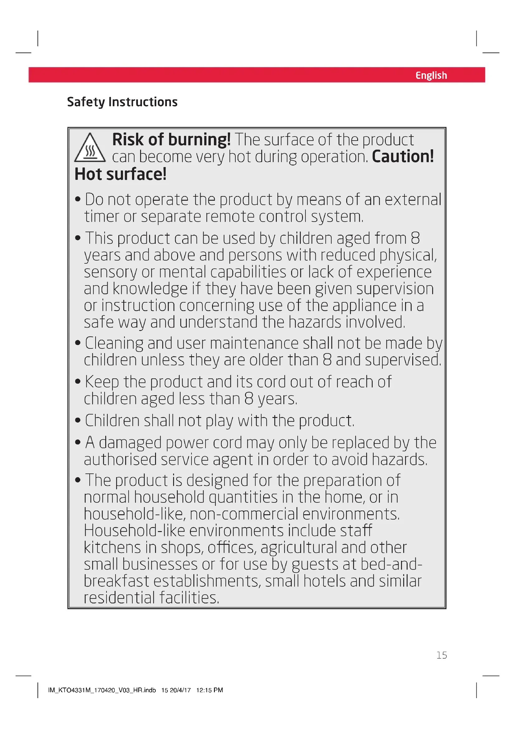 - The product is designed for the preparation of normal household quantities in the home, or in household-like, non-commercial environments. Household-like environments include sta kitchens in shops, oces, agricultural and other small businesses or for use by guests at bed-and- breakfast establishments, small hotels and similar residential facilities. IM_KTO4331M_170420_V03_HR.indb 15 20/4/17 12:15 PMEnglish