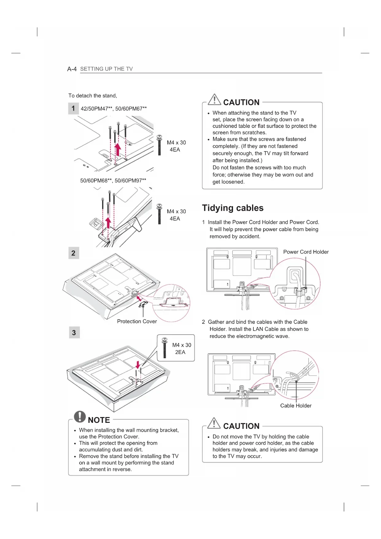 Do not move the TV by holding the cable holder and power cord holder, as the cable holders may break, and injuries and damage to the TV may occur. To detach the stand,