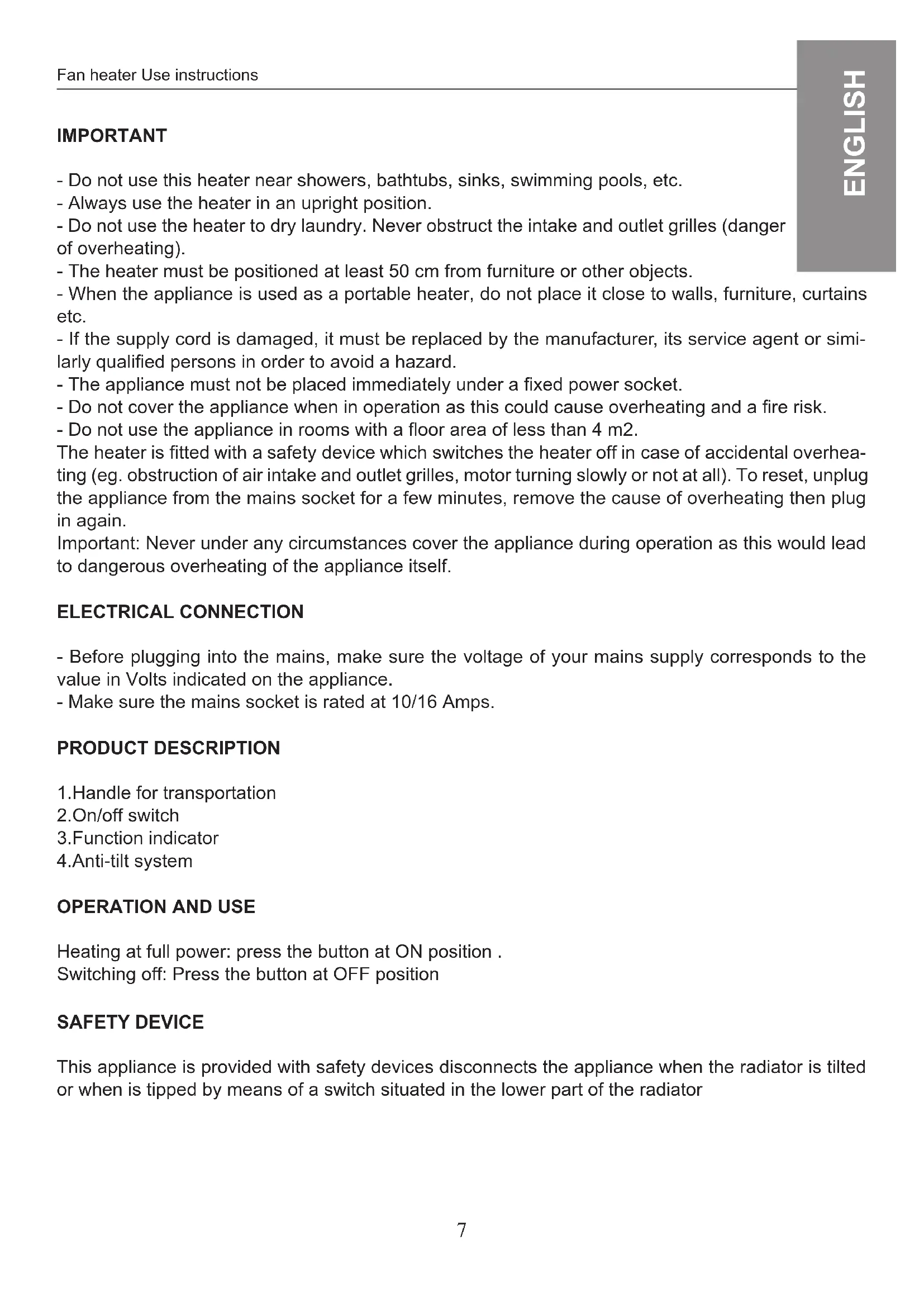 The heater is fitted with a safety device which switches the heater off in case of accidental overheating (eg. obstruction of air intake and outlet grilles, motor turning slowly or not at all). To reset, unplug the appliance from the mains socket for a few minutes, remove the cause of overheating then plug in again.
