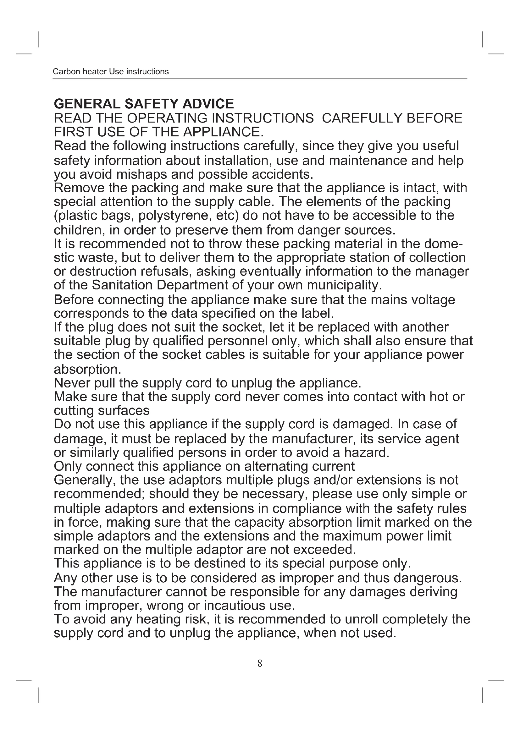FIRST USE OF THE APPLIANCE. Read the following instructions carefully, since they give you useful safety information about installation, use and maintenance and help you avoid mishaps and possible accidents. Remove the packing and make sure that the appliance is intact, with special attention to the supply cable. The elements of the packing (plastic bags, polystyrene, etc) do not have to be accessible to the children, in order to preserve them from danger sources. It is recommended not to throw these packing material in the dome- stic waste, but to deliver them to the appropriate station of collection or destruction refusals, asking eventually information to the manager of the Sanitation Department of your own municipality. Before connecting the appliance make sure that the mains voltage corresponds to the data specied on the label. If the plug does not suit the socket, let it be replaced with another suitable plug by qualied personnel only, which shall also ensure that the section of the socket cables is suitable for your appliance power absorption. Never pull the supply cord to unplug the appliance. Make sure that the supply cord never comes into contact with hot or cutting surfaces Do not use this appliance if the supply cord is damaged. In case of damage, it must be replaced by the manufacturer, its service agent or similarly qualied persons in order to avoid a hazard. Only connect this appliance on alternating current Generally, the use adaptors multiple plugs and/or extensions is not recommended; should they be necessary, please use only simple or multiple adaptors and extensions in compliance with the safety rules in force, making sure that the capacity absorption limit marked on the simple adaptors and the extensions and the maximum power limit marked on the multiple adaptor are not exceeded. This appliance is to be destined to its special purpose only. Any other use is to be considered as improper and thus dangerous. The manufacturer cannot be responsible for any damages deriving from improper, wrong or incautious use. To avoid any heating risk, it is recommended to unroll completely the supply cord and to unplug the appliance, when not used.9 Carbon heater Use instructions