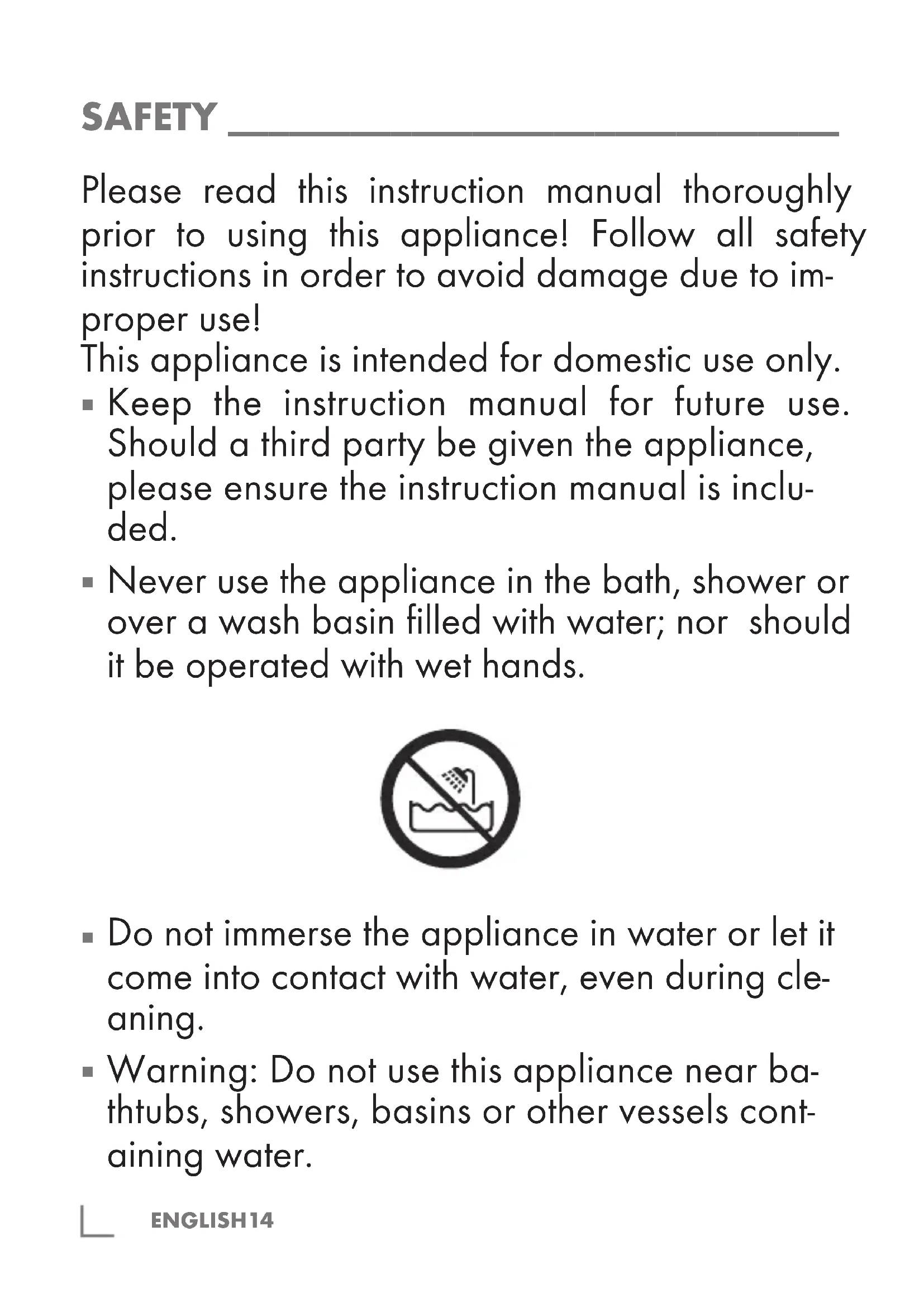 Never use the appliance in the bath, shower or over a wash basin filled with water; nor should it be operated with wet hands.