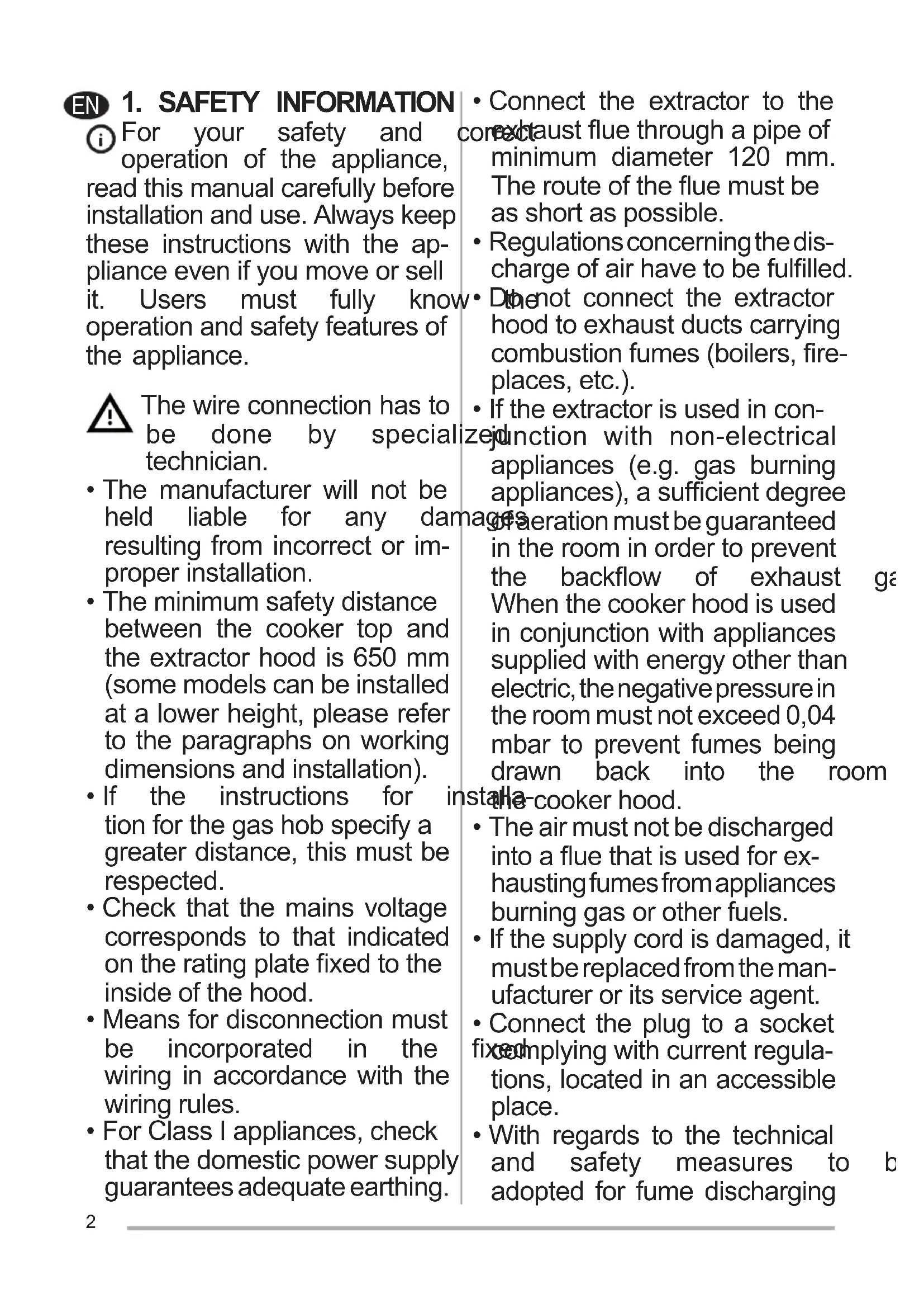 - Iftheextractorisusedincon- junction with non-electrical appliances (e.g. gas burning appliances),asufcientdegree of aeration must be guaranteed in the room in order to prevent the backow of exhaust gas. When the cooker hood is used in conjunction with appliances suppliedwithenergyotherthan electric, the negative pressure in the room must not exceed 0,04 mbar to prevent fumes being drawn back into the room by the cooker hood.